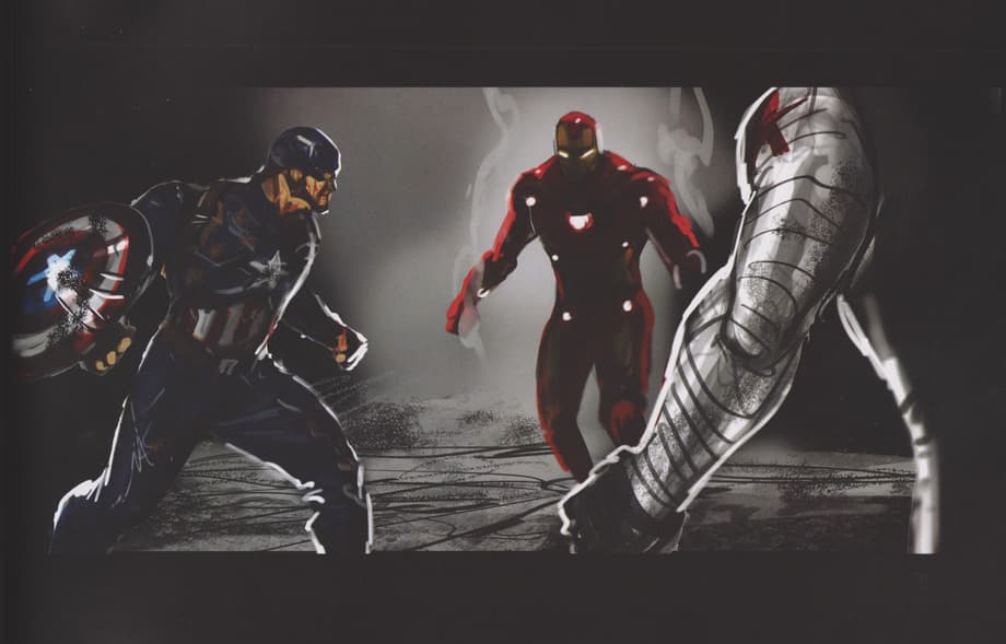 The coolest thing about this shot is the fact it's Bucky wielding the shield to repel one of Iron Man's blasts while Steve Rogers dodges out of the way just moments before throwing a punch. It's a cool piece of artwork but showing Tony outnumbered like this makes Steve and Bucky look a little bad.