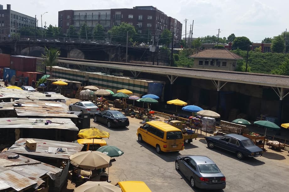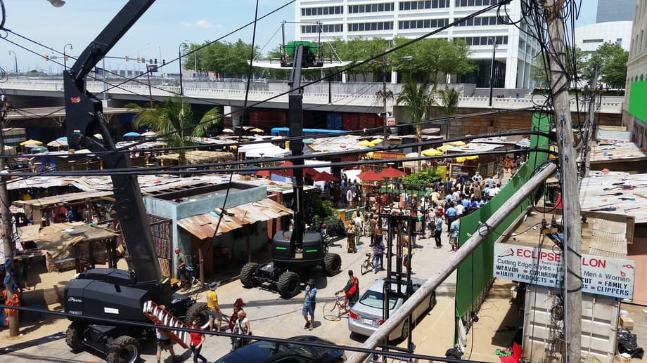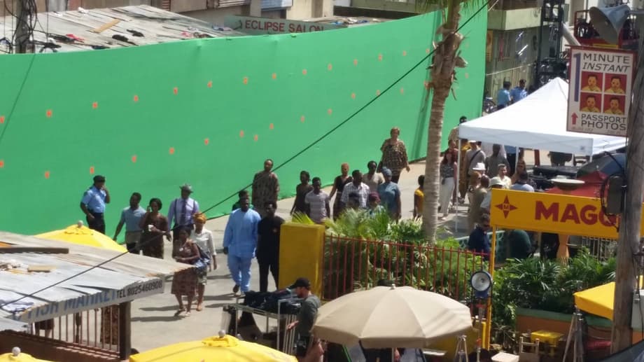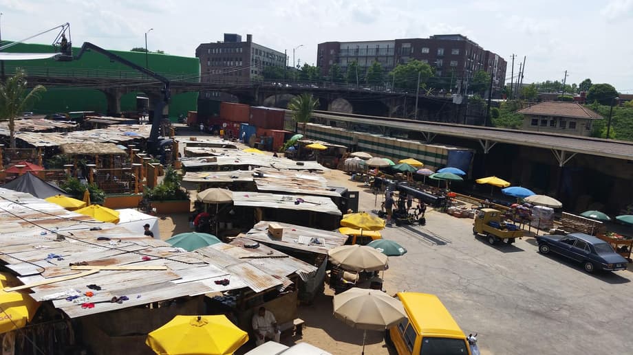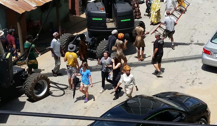 In addition to the scenes with Chris Evans (Steve Rogers), Scarlett Johansson (Natasha Romanoff), Anthony Mackie (Sam Wilson), and Emily VanCamp (Sharon Carter), Captain America: Civil War also filmed scenes on the African Market village set today. There was no sign of Chadwick Boseman's Black Panther, but Facebook user Cindy Blankenship saw Elizabeth Olsen (Wanda Maximoff) on the location in black civvies, as well as several "African" extras. According to the photog, Olsen was "drinking coffee at a table in the cafe" in one of the many scenes that she shot on the location. Although she's hiding her face, see the Scarlet Witch in the first of the five set photos below.