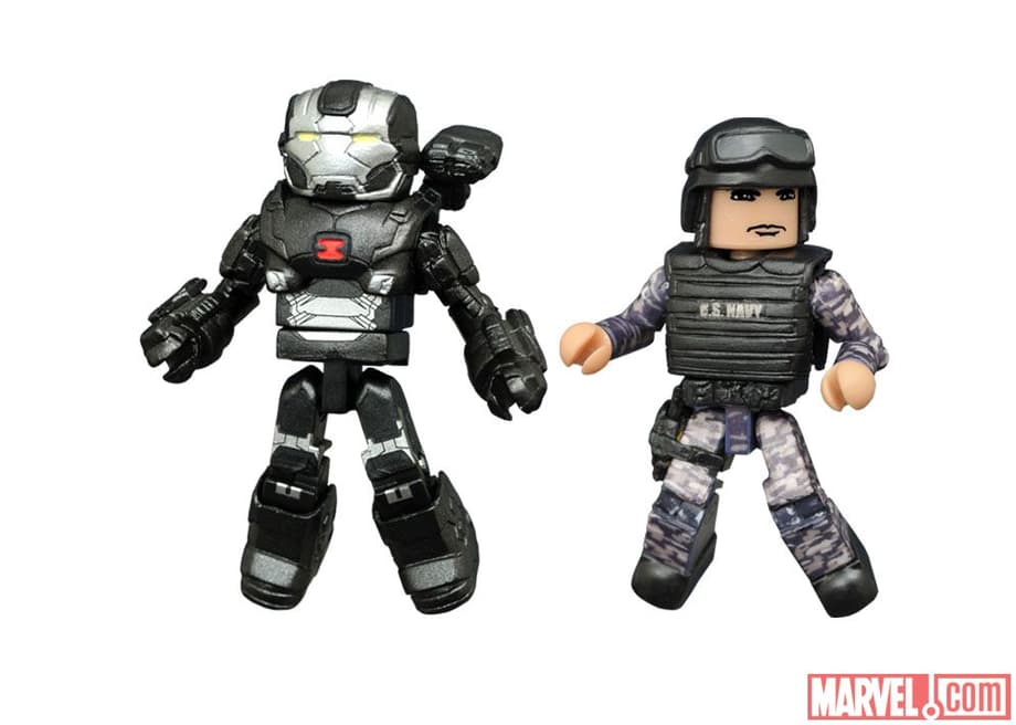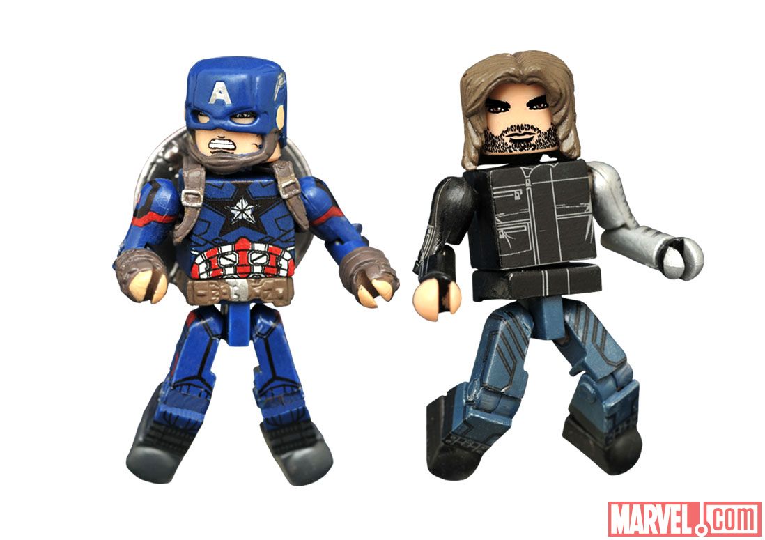 Due in comic shops and specialty stores by late Spring 2016, this assortment of Marvel Minimates will feature three two-packs -- Captain America with Winter Soldier, Iron Man with Black Panther and the comic shop-exclusive War Machine with Guard -- plus a rare, one-per-case variant two-pack with a Battle-Damaged War Machine and Guard! Around the same time, look for the Steve/Bucky and Tony/T’Challa sets to also be at Toys“R”Us stores, along with their own exclusive set -- Vision with Hawkeye! Then, later that summer, both comic shops and Toys”R”Us will see a second assortment with even more characters from the movie! Each Minimates mini-figure stands 2” tall with 14 points of articulation, and features fully interchangeable parts and accessories. Also, each two-pack comes packaged in a full-color window box with SRP of $9.99.