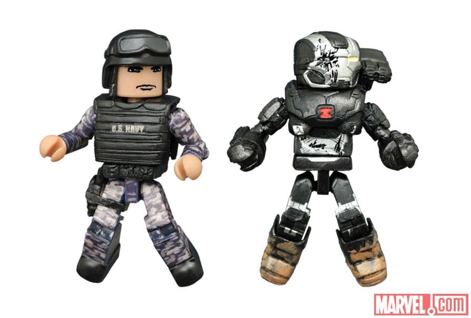 Ahead of next month’s annual New York Toy Fair, Marvel.com has just revealed a first look at the two-inch minimates based on Earth’s Mightiest Heroes as they’ll appear and become divided in Captain America: Civil War this summer. Featuring Captain America, Iron Man, the Winter Soldier, the Black Panther, War Machine (battle-damaged) and a Navy Guard, as well as Hawkeye and even the Vision, the assortment can be seen in the images below along with some availability details.