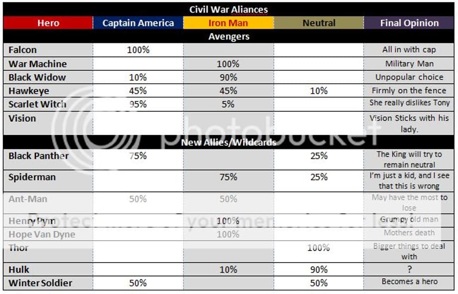 Nick Fury: Nick always sides with the avengers, mostly because it suits his interest at the time. This time he has to pick a side between two separate factions of Avengers. Fury has authorized surveillance on all the enhanced avengers. He has used Hawkeye, Black Widow, Sharon Carter, and Maria Hill to accomplish this task. Those four are loyal to Fury. Are they loyal enough to be agents and turn their back on former teammates is the question. It is one of the big reasons I’ve had a hard time deciding where Widow and Hawkeye end up. If utilized properly Fury could be a very important character in this movie. His end goal is to quash this fraction in the team, and make the team function as a unit again. He will help both sides.