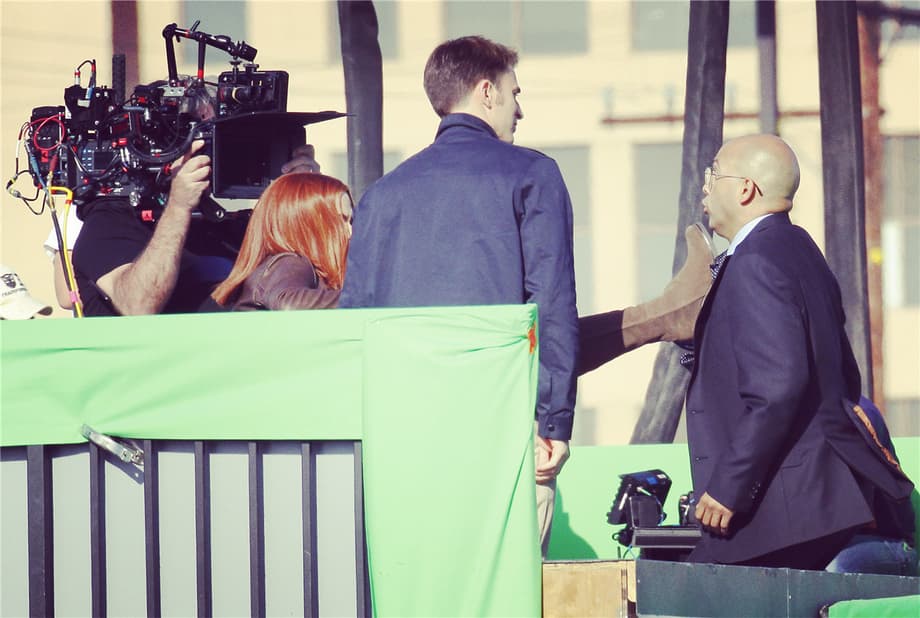 Filming for Captain America: The Winter Soldier continued today, Monday, in Los Angeles, where stars Chris Evans & Scarlett Johansson were spotted filming a kick-ass scene with a certain S.H.I.E.L.D. agent. The scene appears to involve Steve Rogers and Natasha Romanoff, aka Black Widow, confronting[SPOILER ALERT] Agent Jasper Sitwell, played by returning actor Maximiliano Hernández. Check out the high-quality photos below, courtesy of Pacific Coast News!