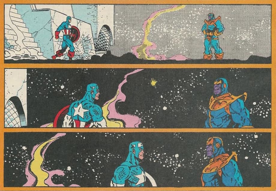 To start off this list, we're going all the way back to 1991 for the six-issue Infinity Gauntlet series, which as many of us know will serve as a partial basis for the two-part Avengers: Infinity War movie in 2018. The scene we're observing takes place in issue four, when Earth's Mightiest Heroes are battling Thanos, an incredibly powered being from the planet of Titan.