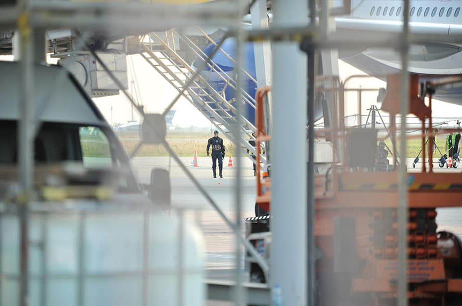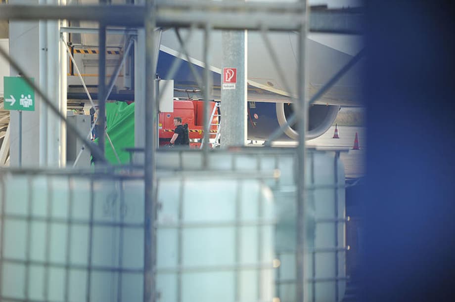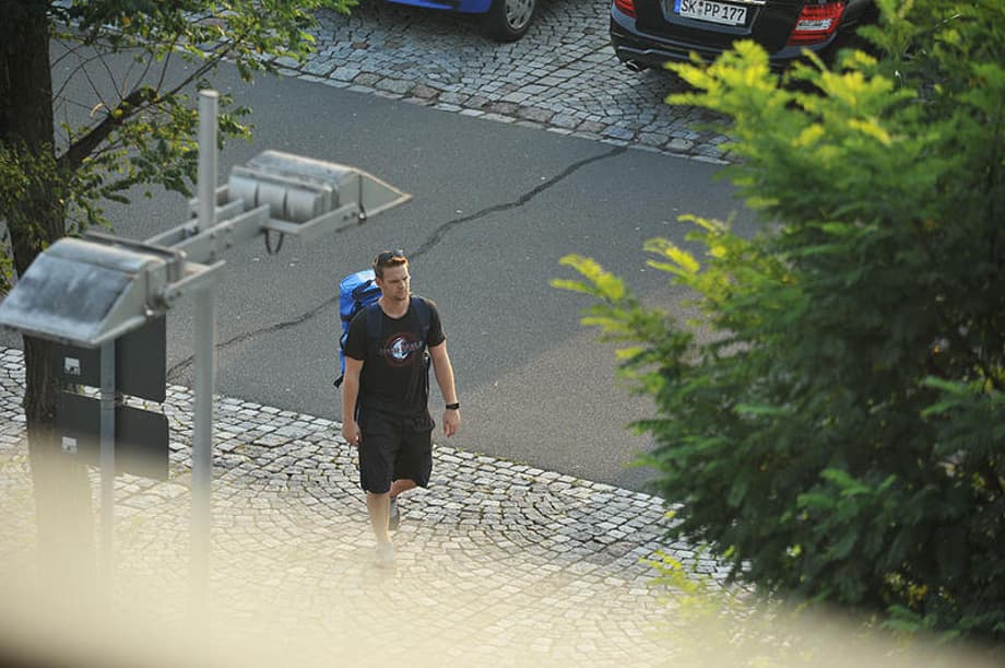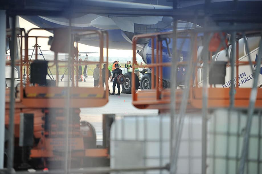 After an extensive five-month shoot, principal photography on Captain America: Civil War will finally come to a close this week, or rather today. And the latest, if not the last, batch of set photos have come from an airport in Leipzig, Germany, where stars Chris Evans (Captain America) and Sebastian Stan (Winter Soldier) were sighted from a distance in full costume. Also spotted was Jeremy Renner (Hawkeye), or his stunt double, giving us a blurry first glimpse of the archer's new threads. Well, only the back of his quiver and short-sleeve vest are visible, but check it out below!