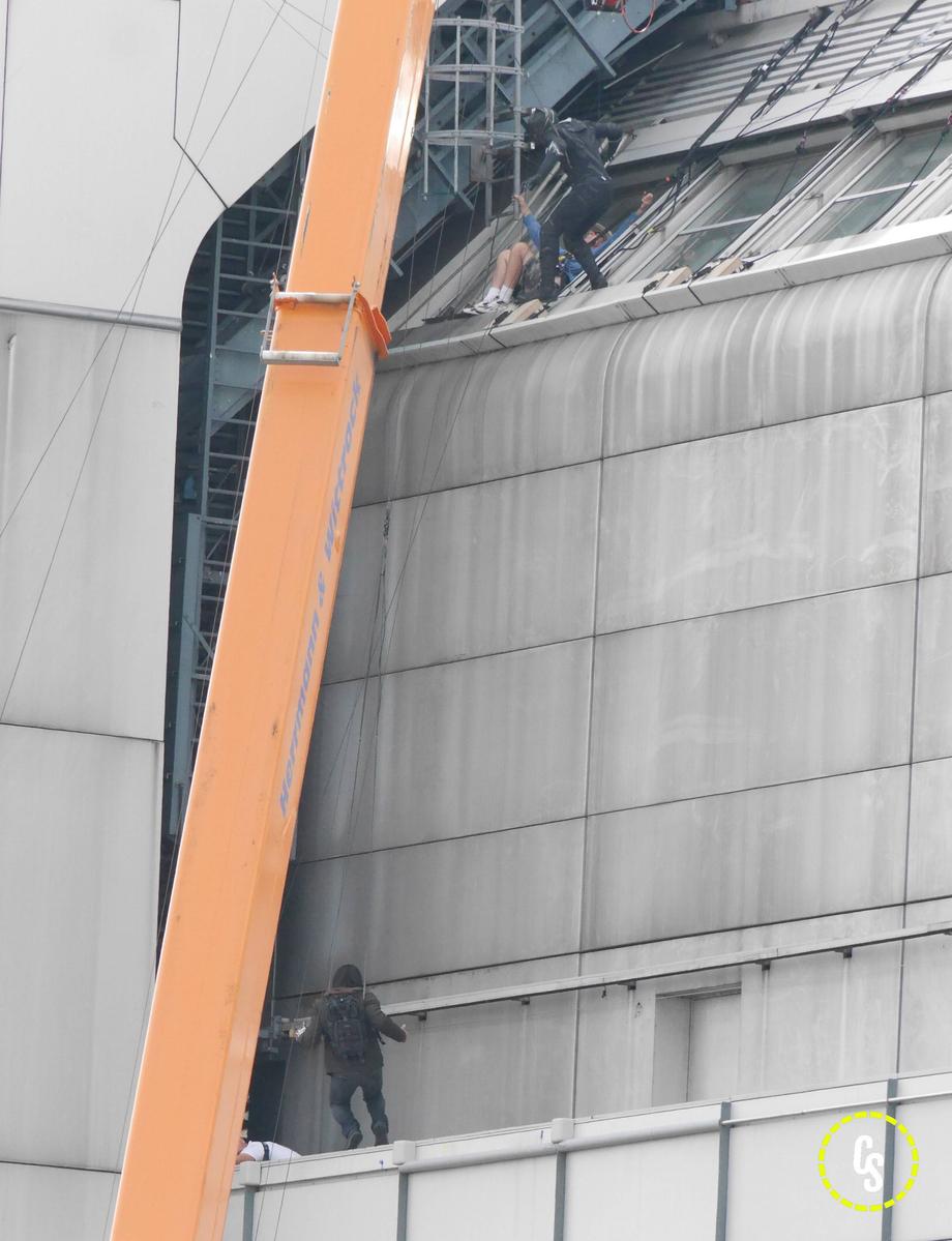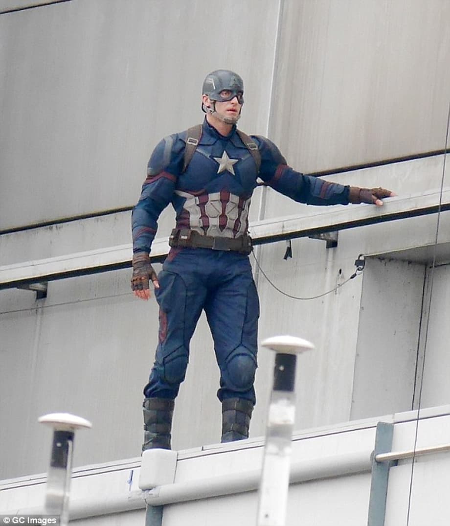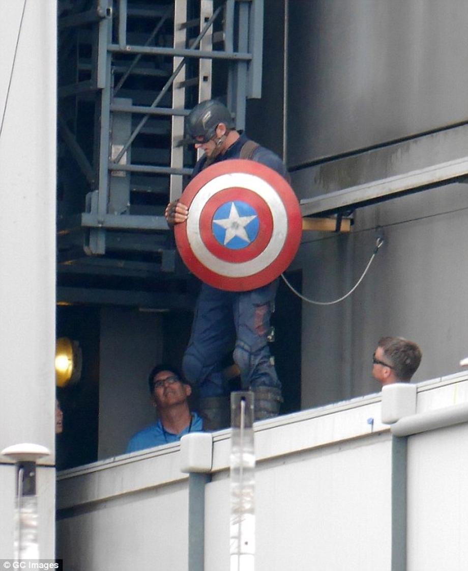 After months of principal photography in Atlanta, Georgia, today's Captain America: Civil War filming in Berlin, Germany, has finally provided our first look at Chadwick Boseman's Black Panther and Sebastian Stan's Winter Soldier. Though it does not appear to be the actors in costume, but rather their respective stunt doubles, they and Chris Evans' double were spotted filming an action scene together on the rooftop of a building that is reportedly doubling for the United Nations headquarters in Vienna, Austria. Check out the photos below, and be on the lookout for more!