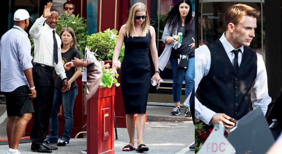 Furthermore, additional Captain America: Civil War set photos feature Evans and VanCamp filming a scene together, as well as Mackie all still in their funeral attire. Check out all the photos below.