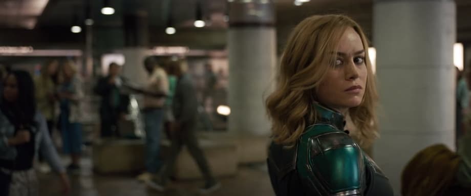 It was smart of Marvel Studios to save this reveal for the movie's first trailer and a lot of fans are no doubt feeling very happy about Captain Marvel not only getting her mask but also her mohawk. She appears to be wearing a breathing apparatus of some sort underwater in this shot but the helmet returns later on in the trailer too, so here's hoping it winds up being a permanent part of her costume.