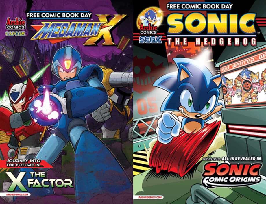 Its TWO free comic books in ONE! Hot off the heels of the ultra-successful Sonic/Mega Man crossover event, "Worlds Collide", comes a showcase issue of the hottest new storylines in both characters' universes – exclusively for Free Comic Book Day! Sonic stars in "Blast to the Past" featuring the origin of his Freedom Fighters! Then, on the flipside of this issue, get ready for the "Mega Man X" crossover event with this primer story!