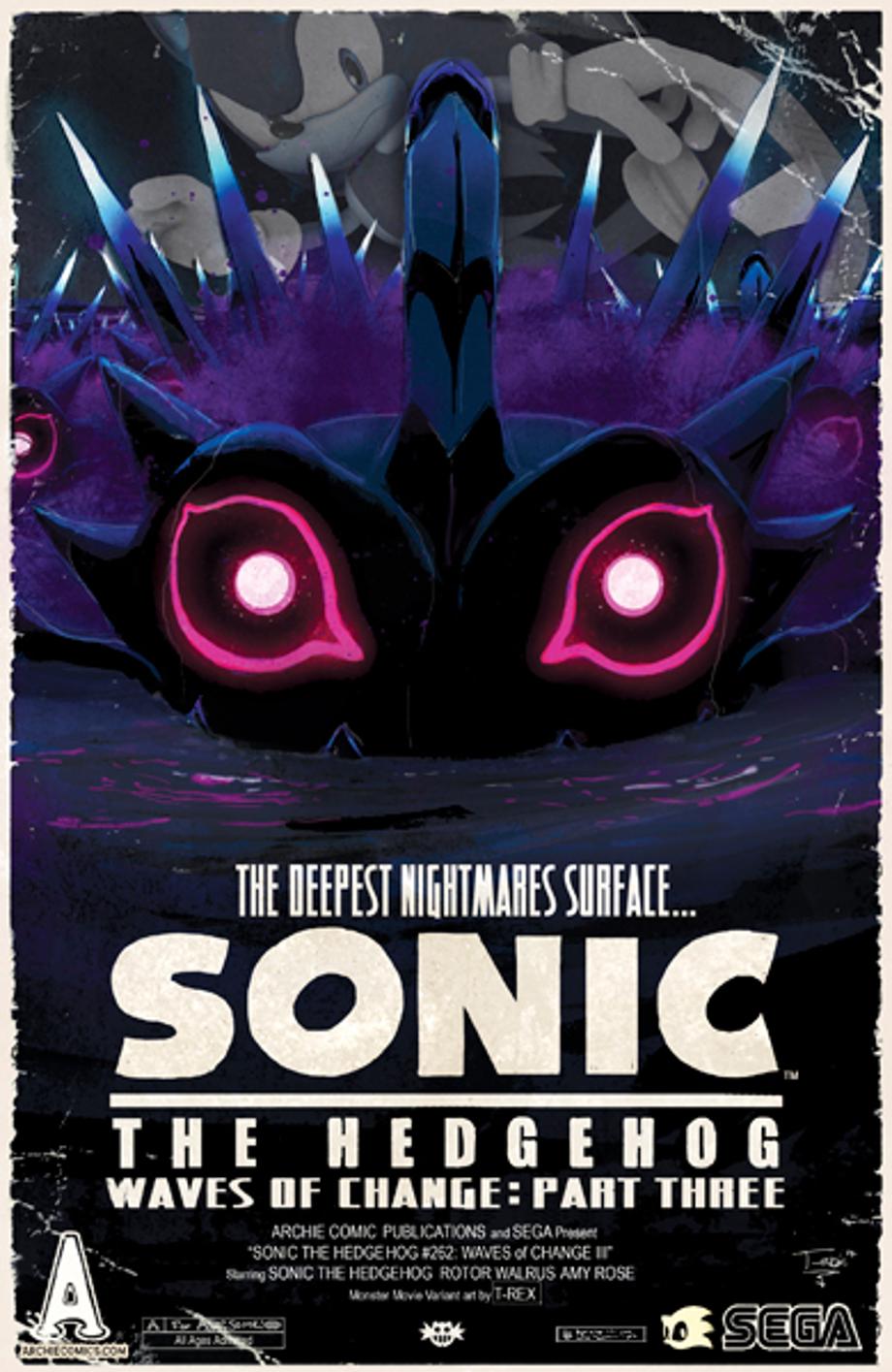 Catch some sun and ride the wave as the aquatic adventure continues in "Waves of Change" Part Three! Sonic faces a city invasion by the ominous Dark Gaia Monsters! To make it even worse, the invasion is underwater—and Sonic can’t swim! As the struggle turns desperate, will it be Amy’s mission to find the key to saving them all, or will Sonic be left to drown? Then, in “The Light in the Dark” Part Two, the Freedom Fighters find what they’re looking for—but will their own divisions bring them down? Featuring new cover art from Ben Bates and an extra-special “monster movie” variant from artist T.REX!