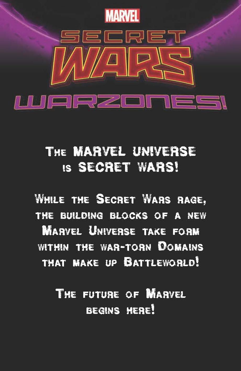 While the Secret Wars rage on, the foundation of a new Marvel Universe take shape within the war-torn domains across Battleworld. The future of Marvel begins in the WARZONES!