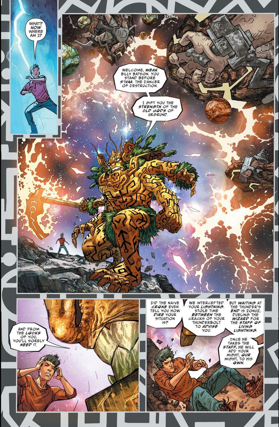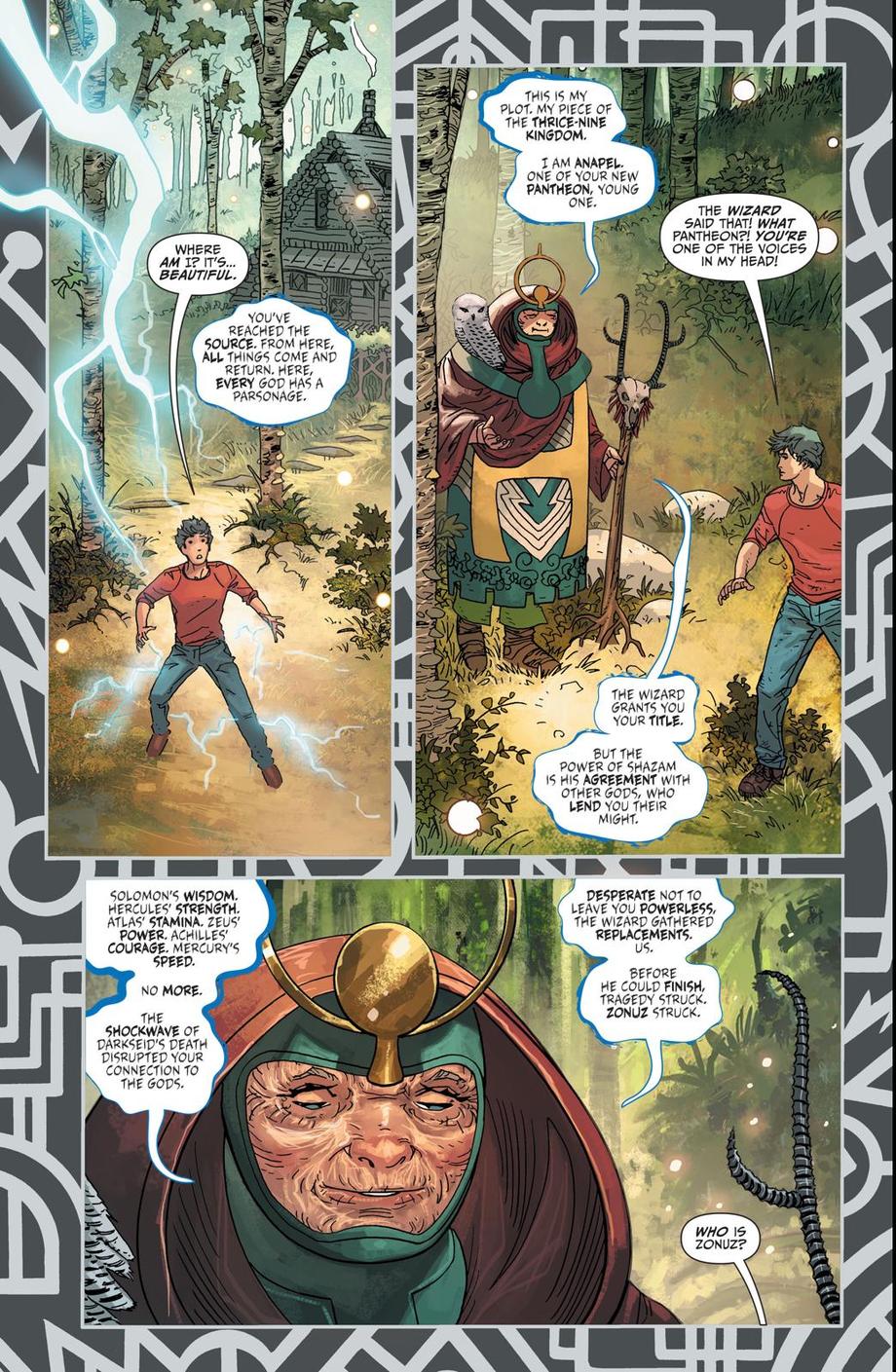 Billy Batson's new pantheon of SHAZAM is now made up of The Strength of S'Ivaa, The Fires of H'Ronmeer, The Compassion of Anapel, The Source Manipulation of Zonuz (Darkseid's Father), The boldness of Ate, and The Lightning of Mamaragan, the Wizard!