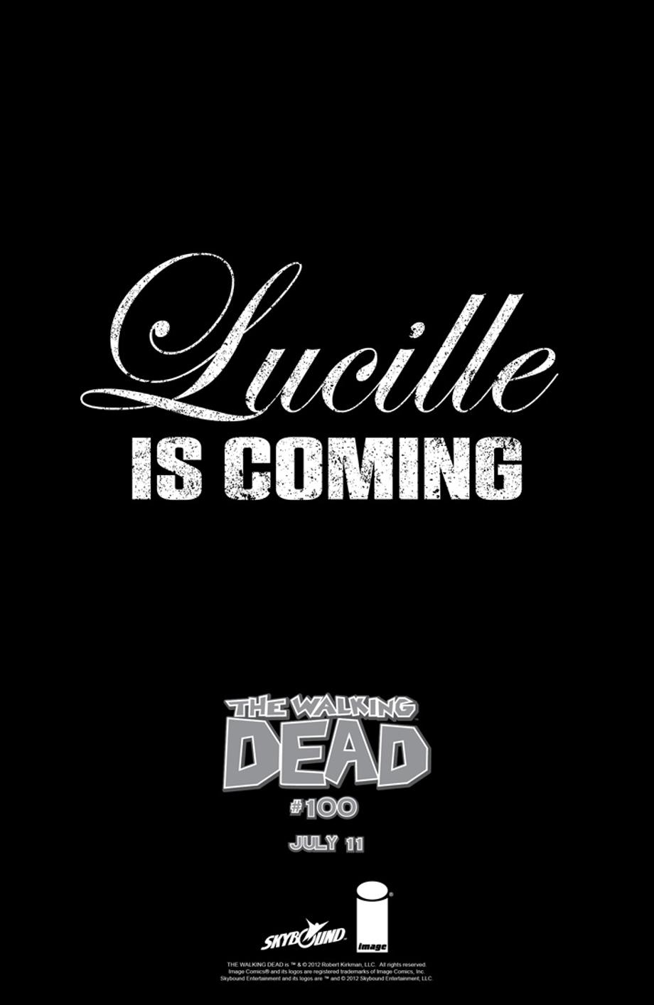 The Walking Dead #99 which releases tomorrow so maybe a few hints will come out of it letting us know who Lucille may be. Remember in the month of May Robert Kirkman had this to say about