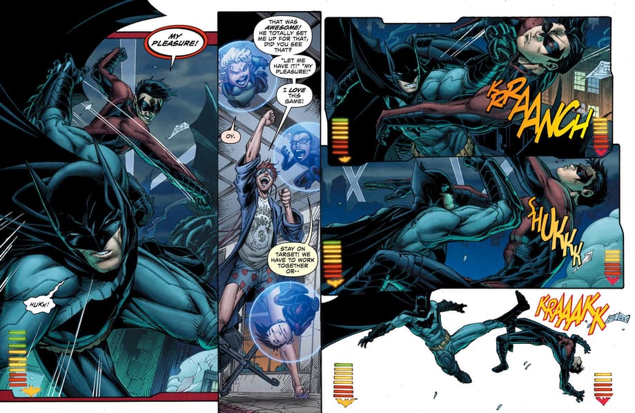 When the new Toymaster uses a secret, potentially deadly element in his new video game, the characters created by players manifest in real life! The ultimate fighting game results—and a world-wide network of players must team up to create the most powerful, skilled Super Heroes imaginable with one goal: To kill Batman. Can Superman come to the rescue before the game claims its victim? Find out in this amazing issue that’s printed in a special horizontal storytelling format.