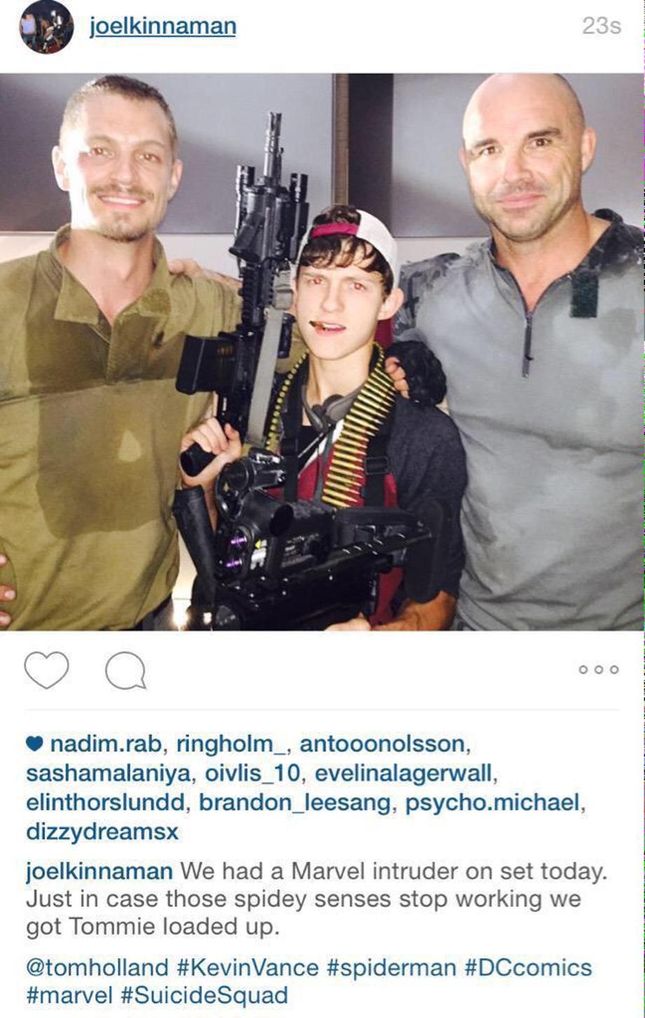 Joel Kinnaman who plays Rick Flag Jr. in Suicide Squad, went to his Instagram earlier today and posted a photo of a very suited up Tom Holland on the set of Suicide Squad.