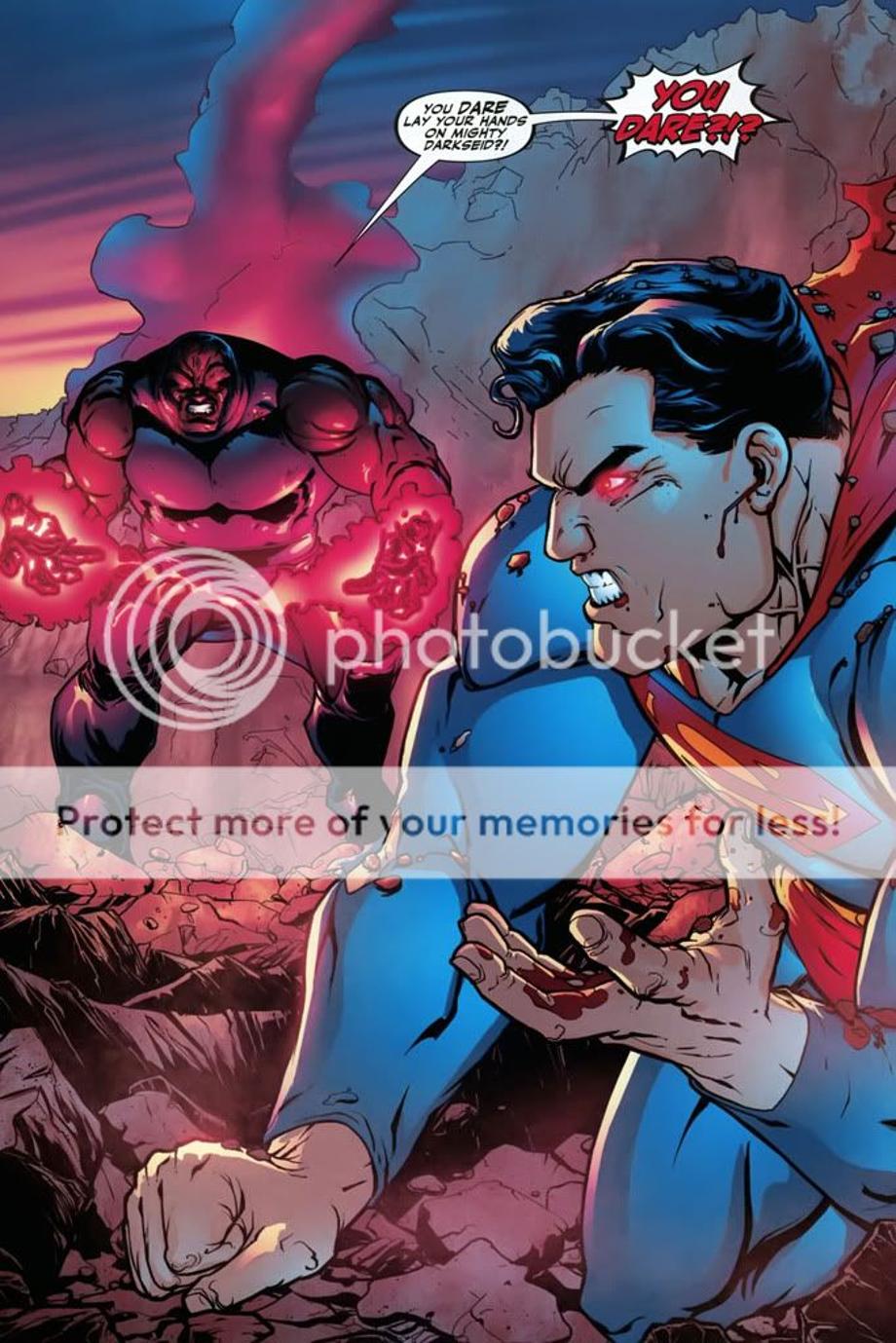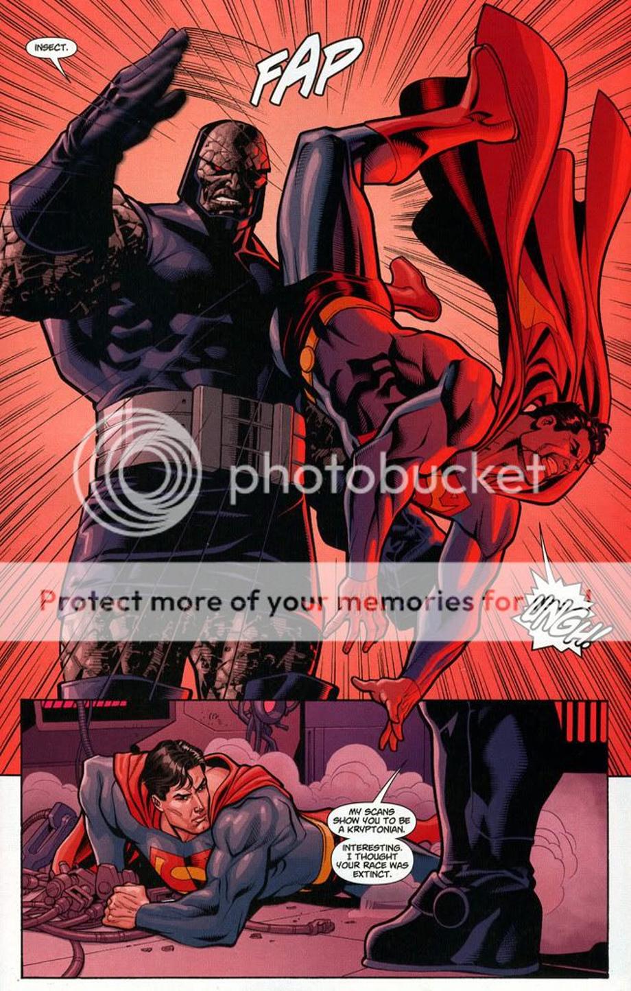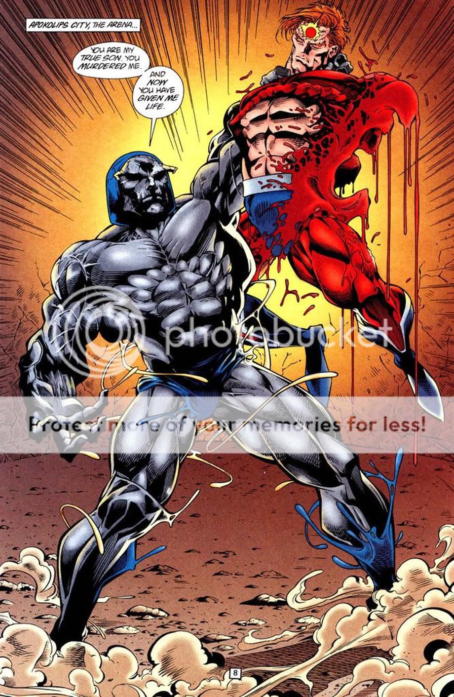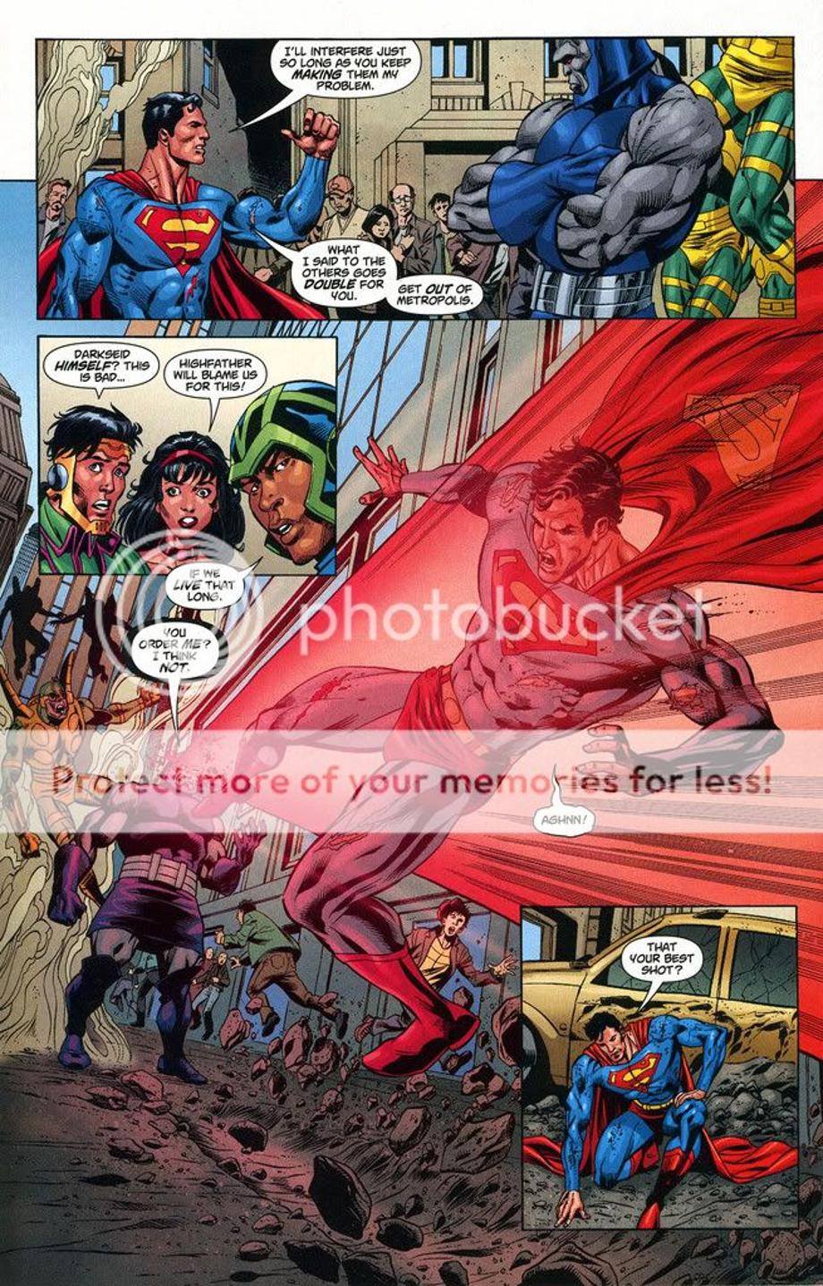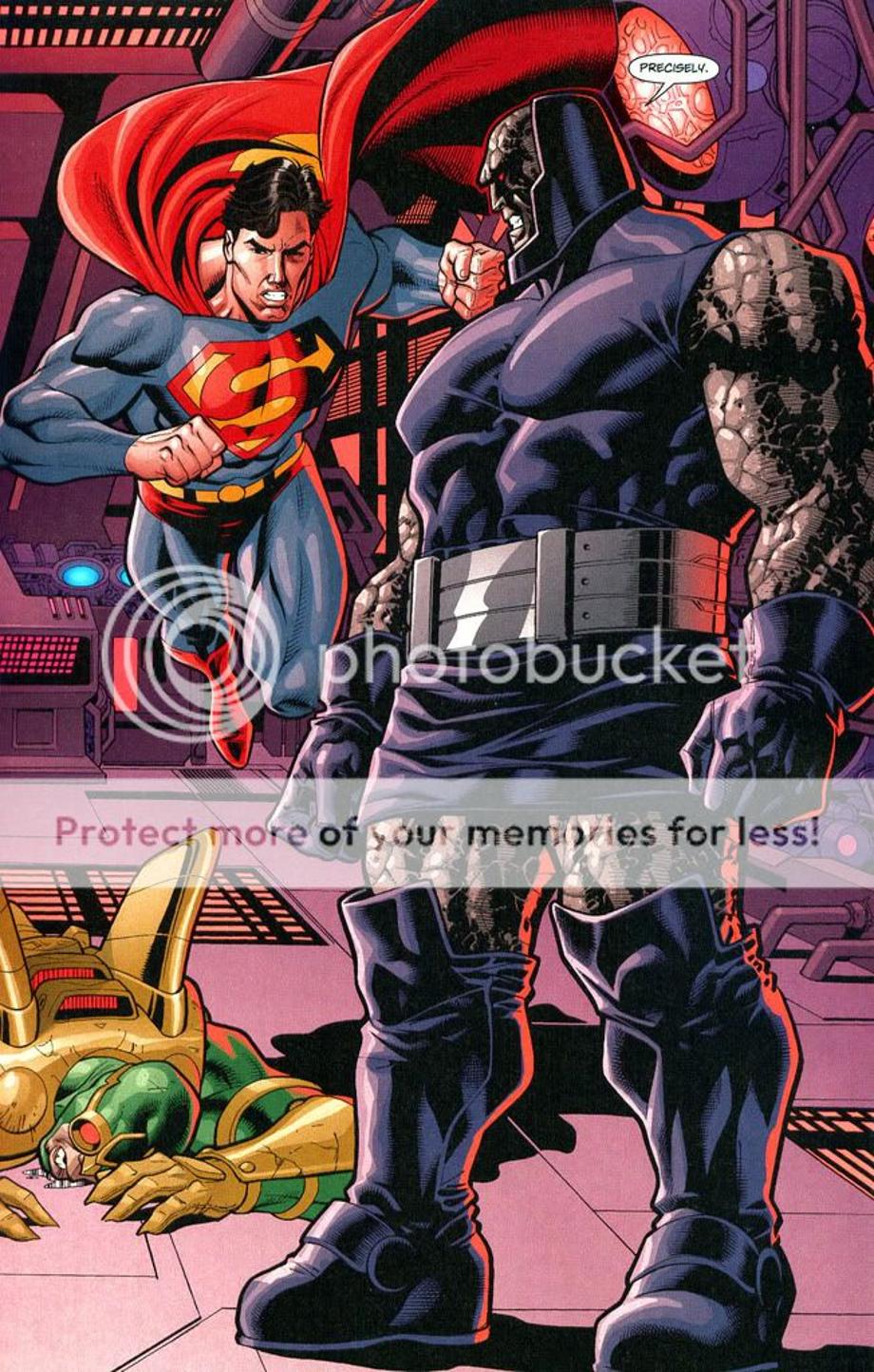 1. An enraged Superman charges at Darkseid, and is easily hit away without much effort.