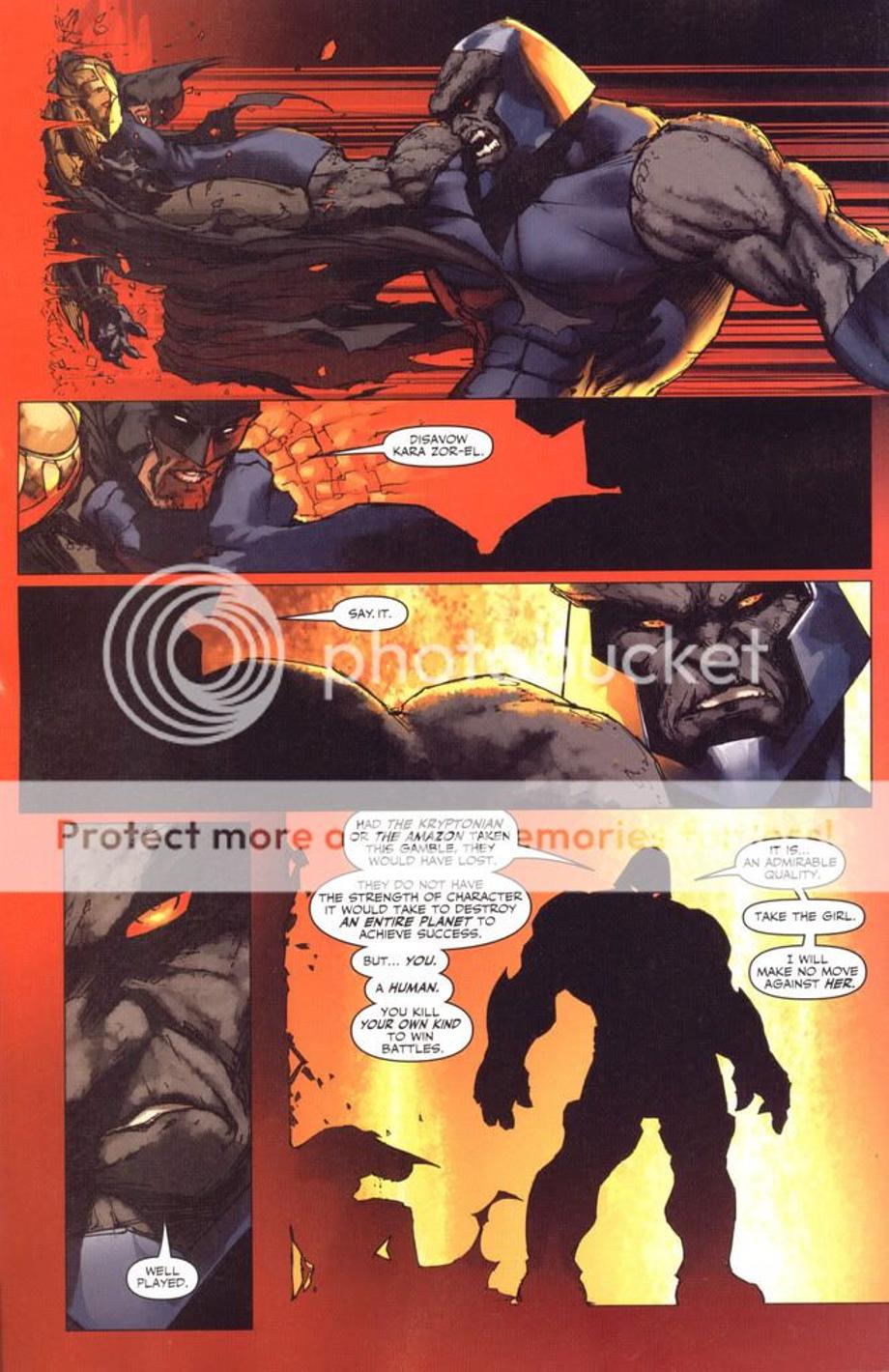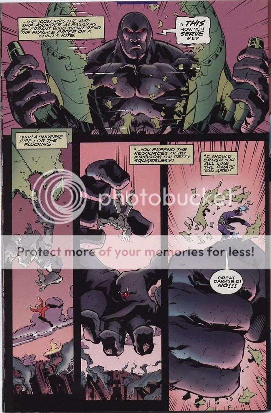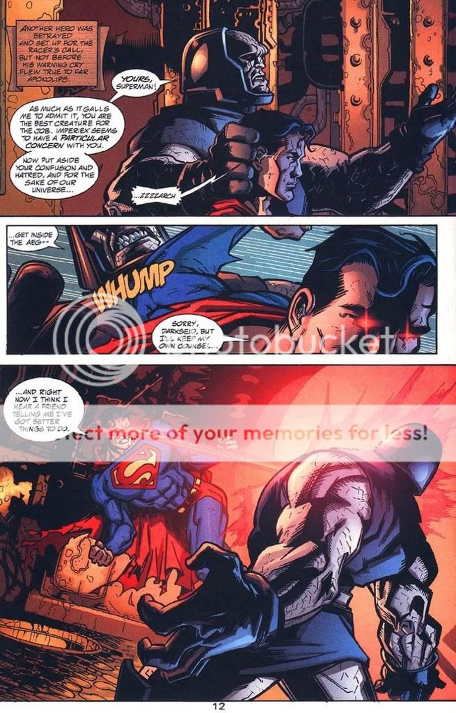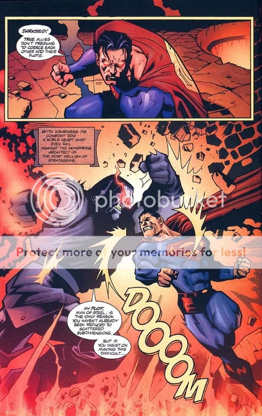 1. An enraged Superman charges at Darkseid, and is easily hit away without much effort.