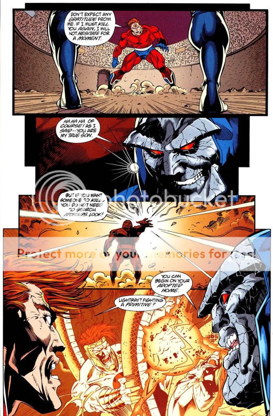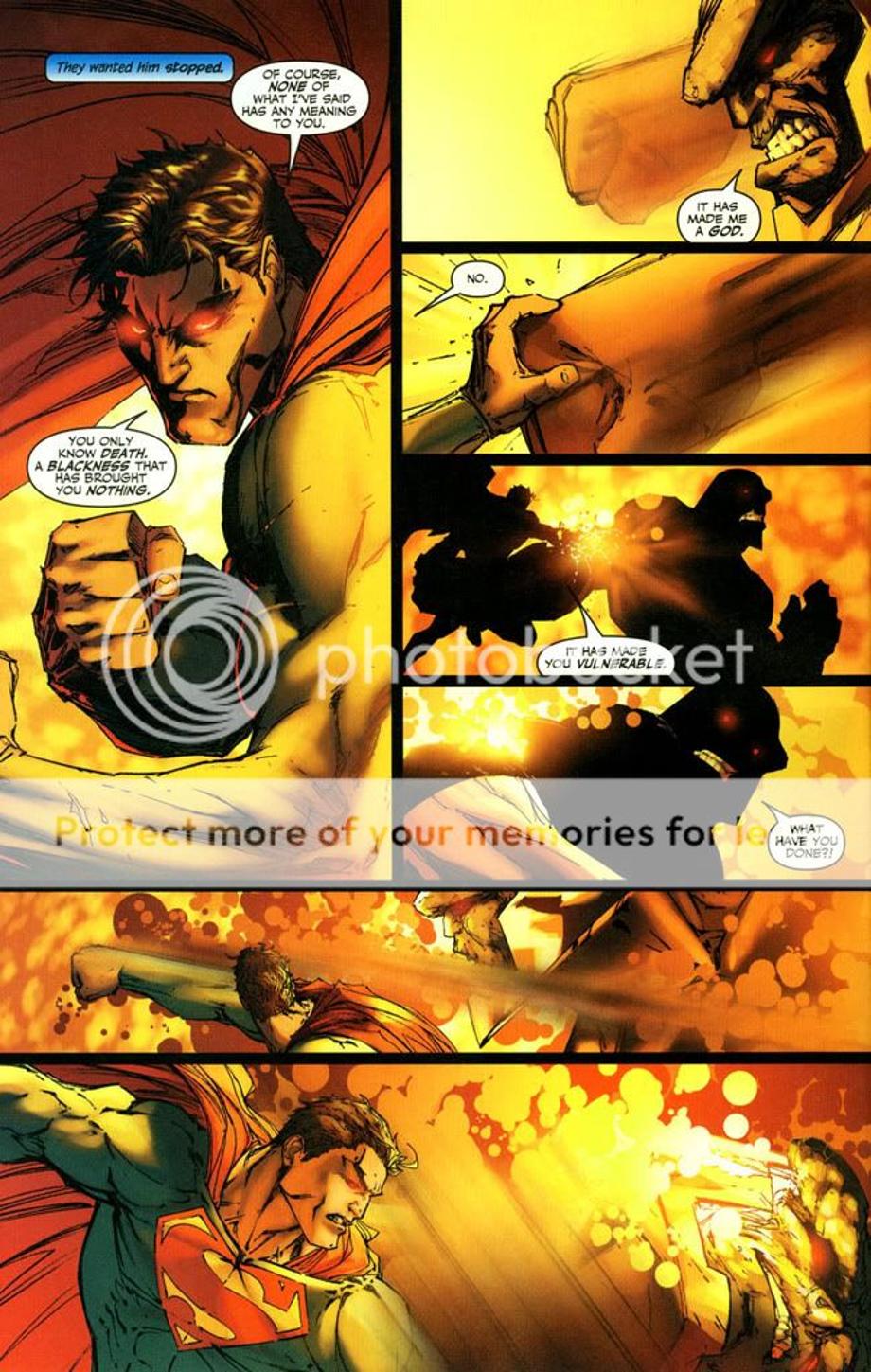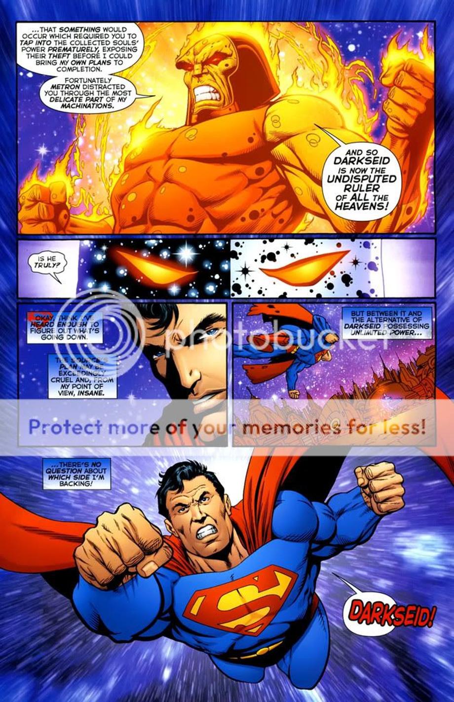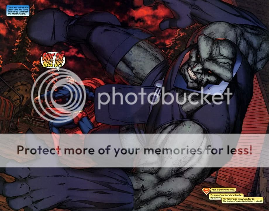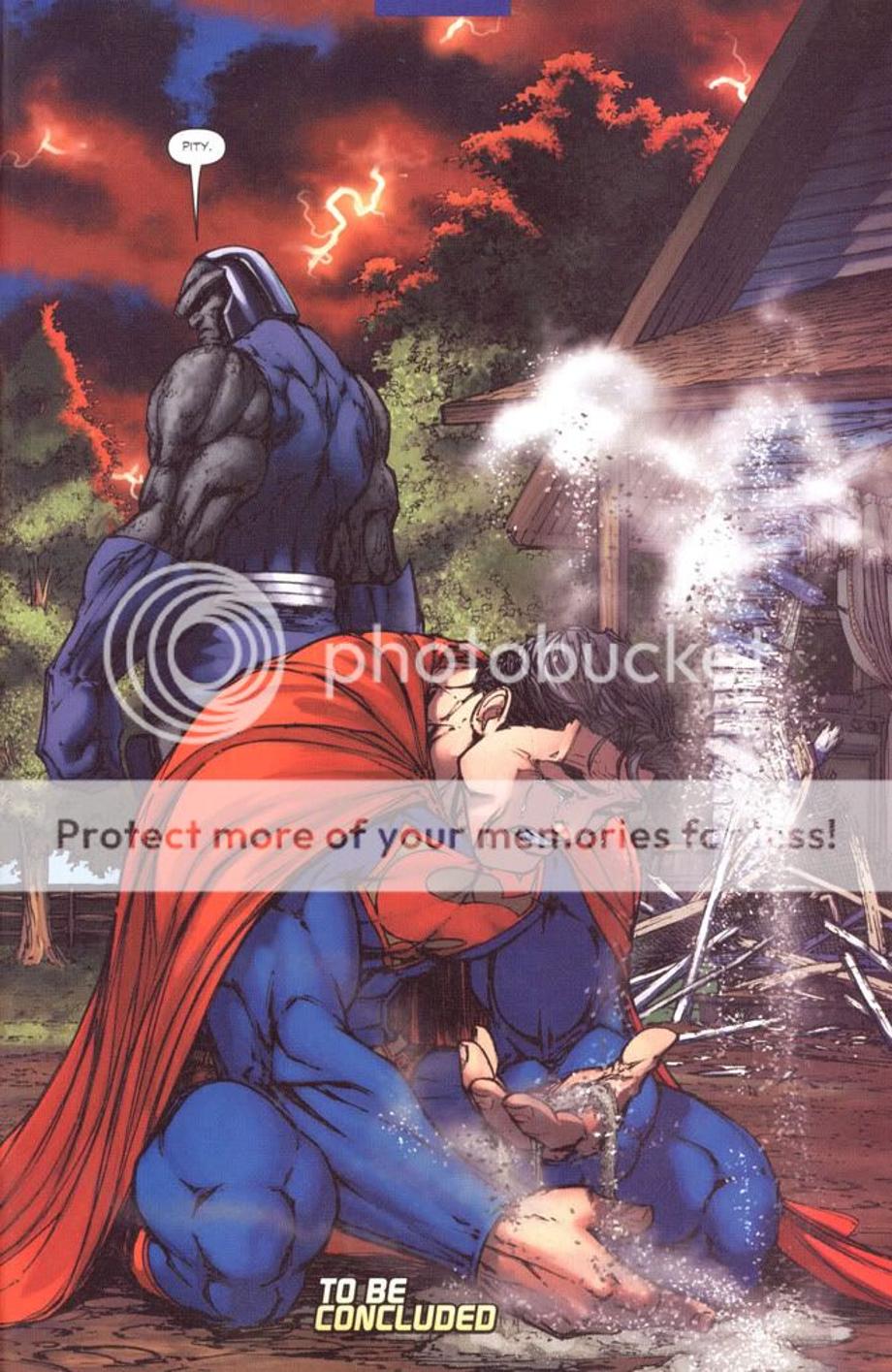 1. An enraged Superman charges at Darkseid, and is easily hit away without much effort.