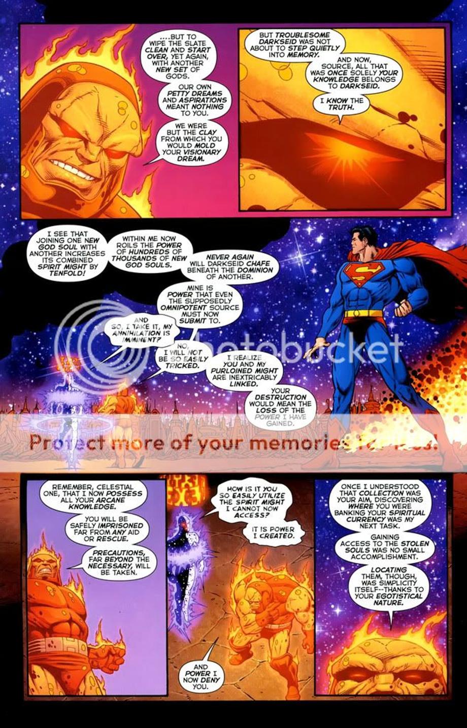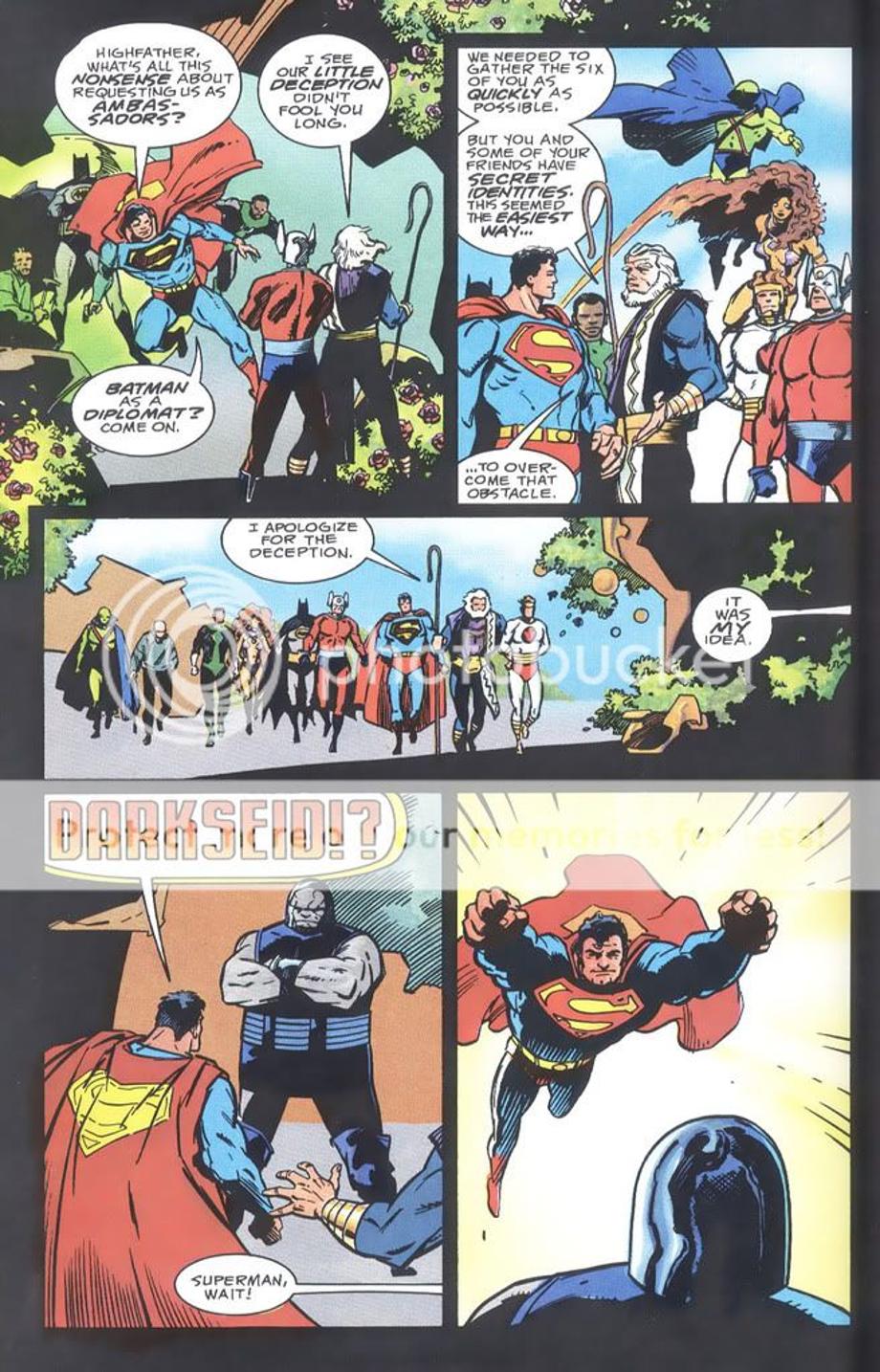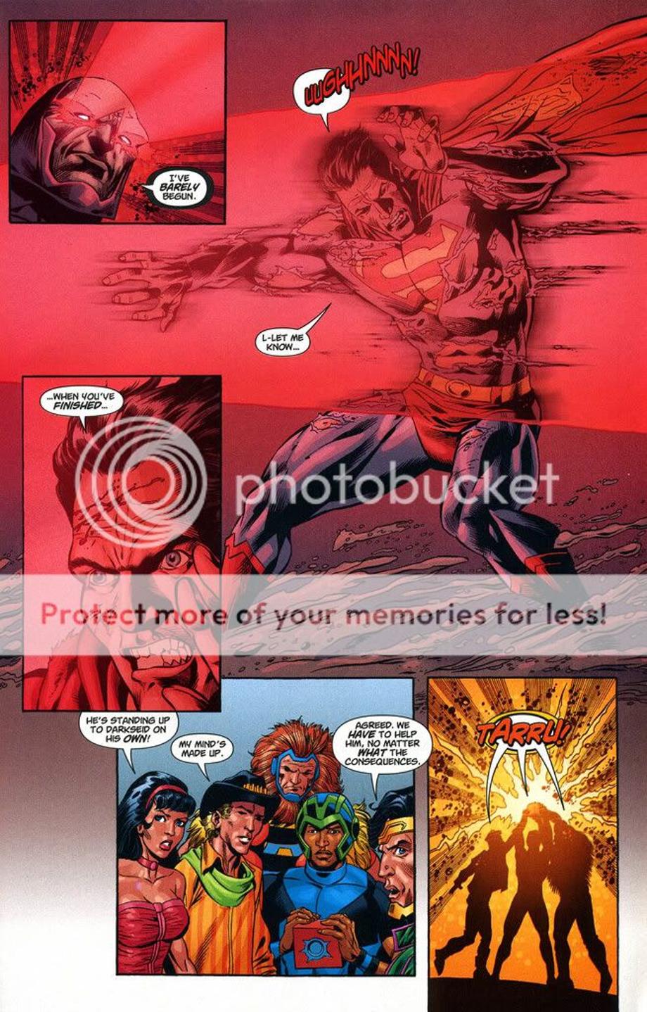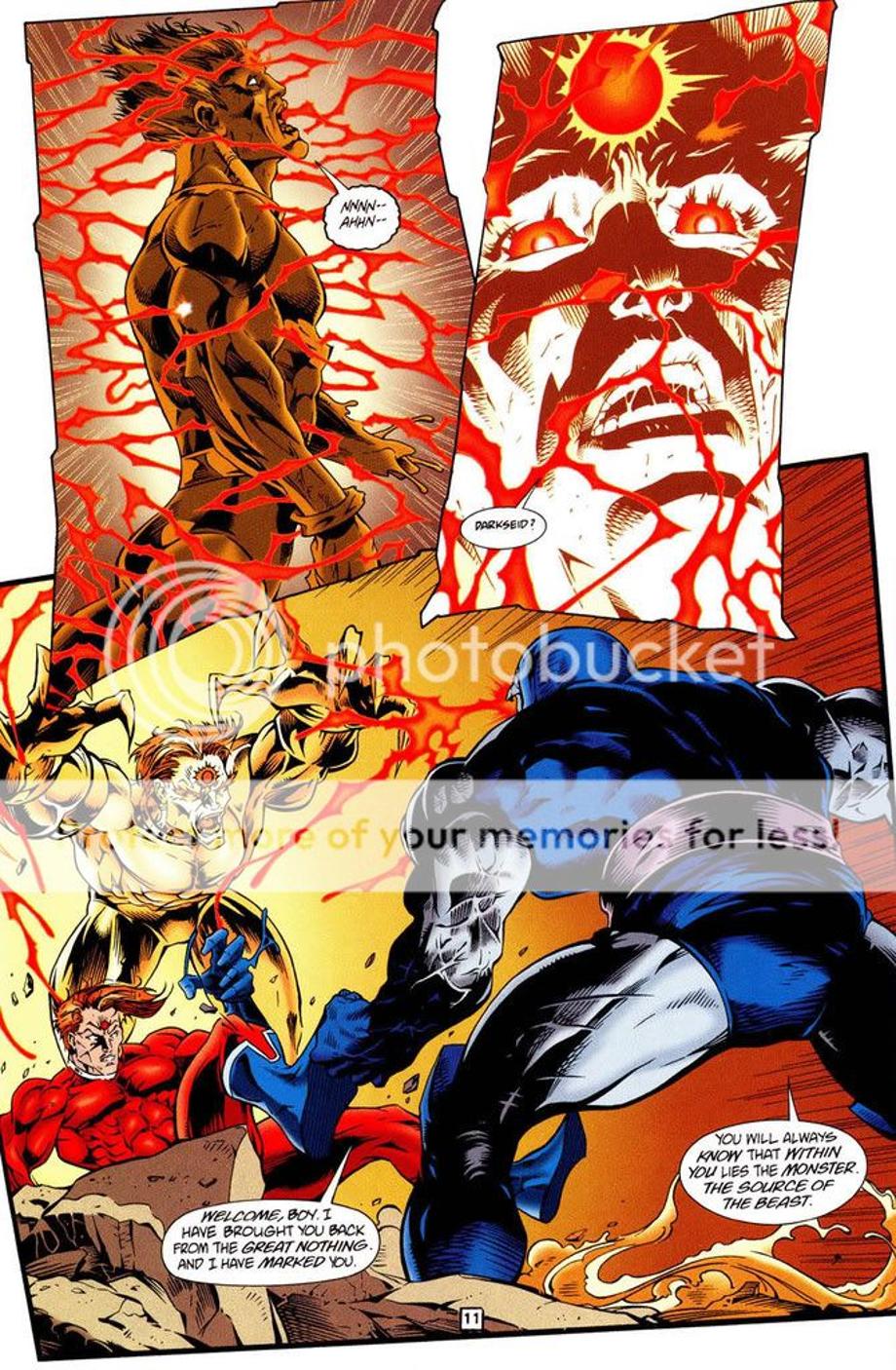 1. An enraged Superman charges at Darkseid, and is easily hit away without much effort.