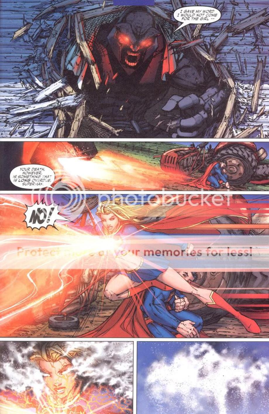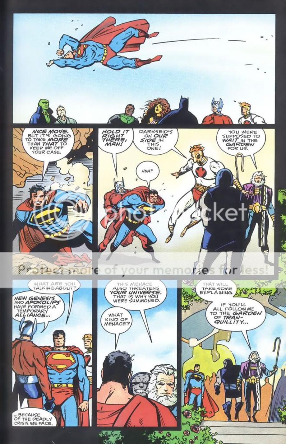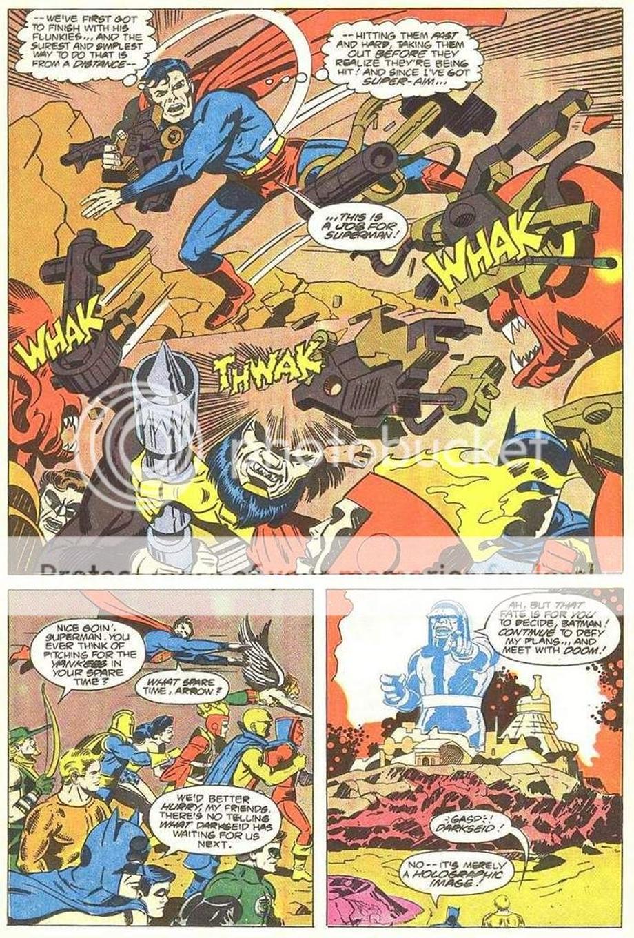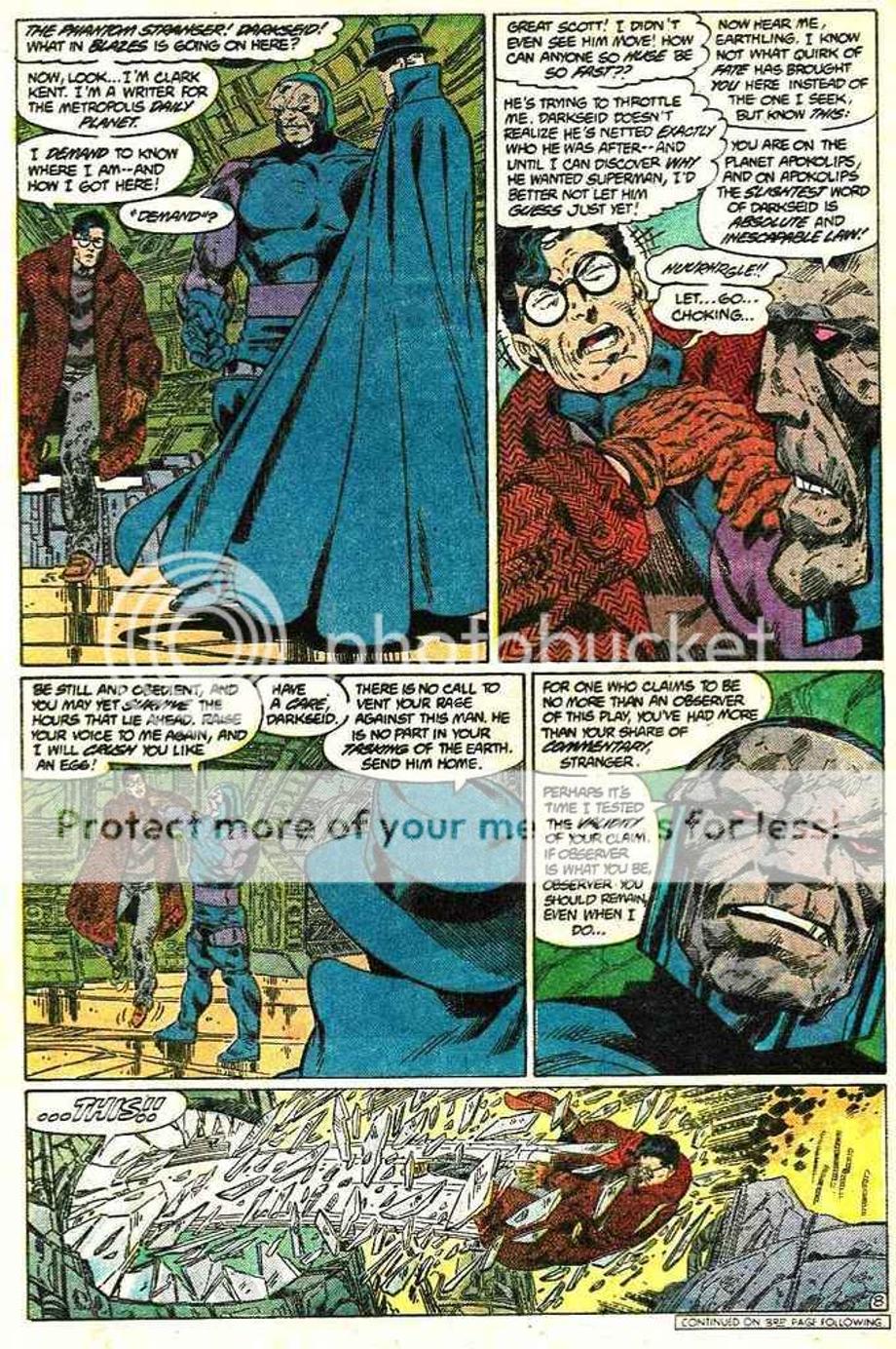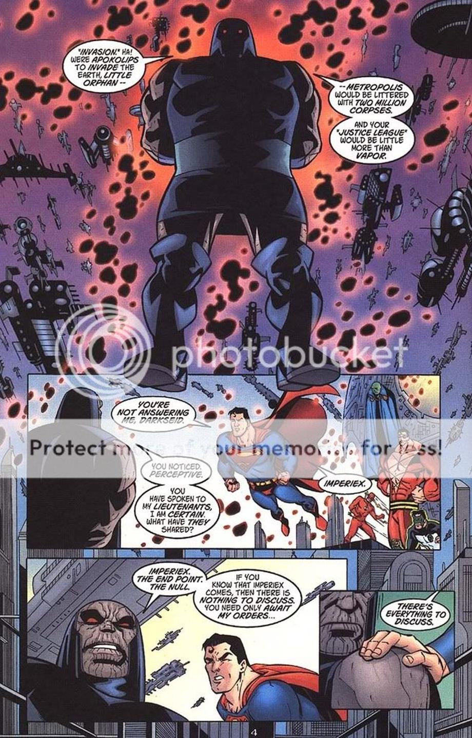 1. An enraged Superman charges at Darkseid, and is easily hit away without much effort.