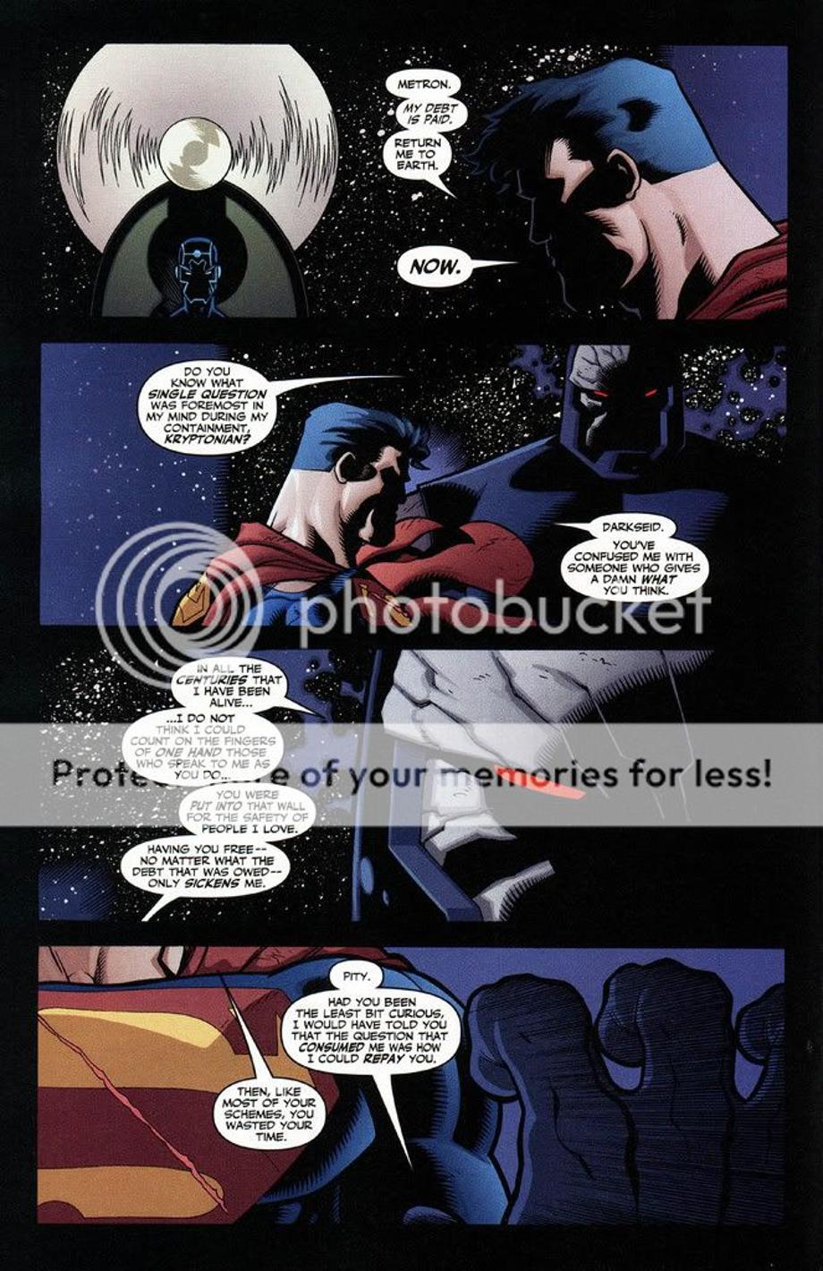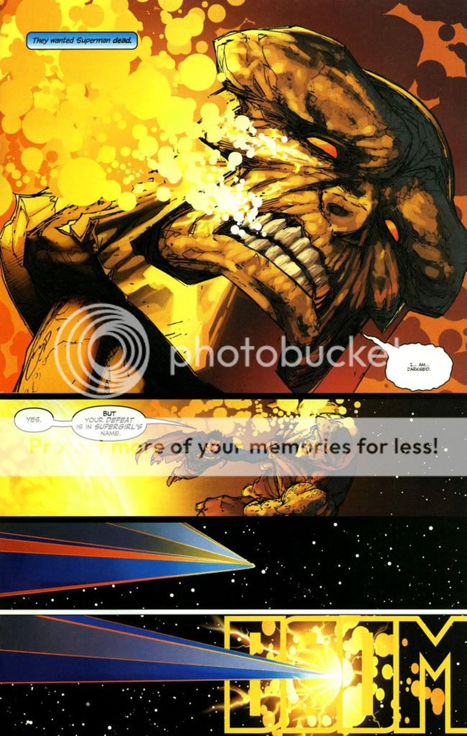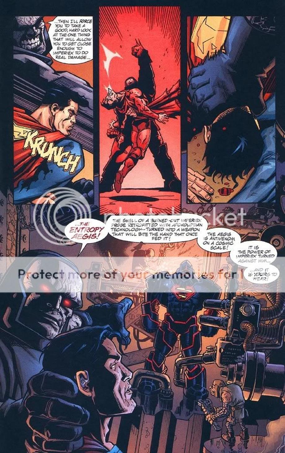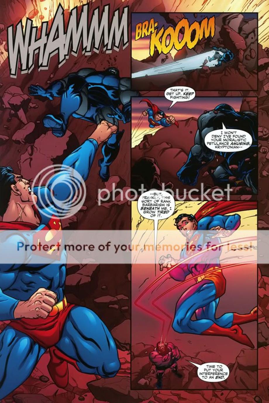 1. An enraged Superman charges at Darkseid, and is easily hit away without much effort.