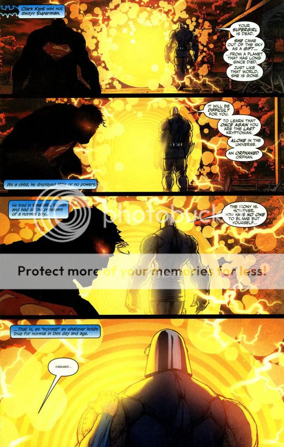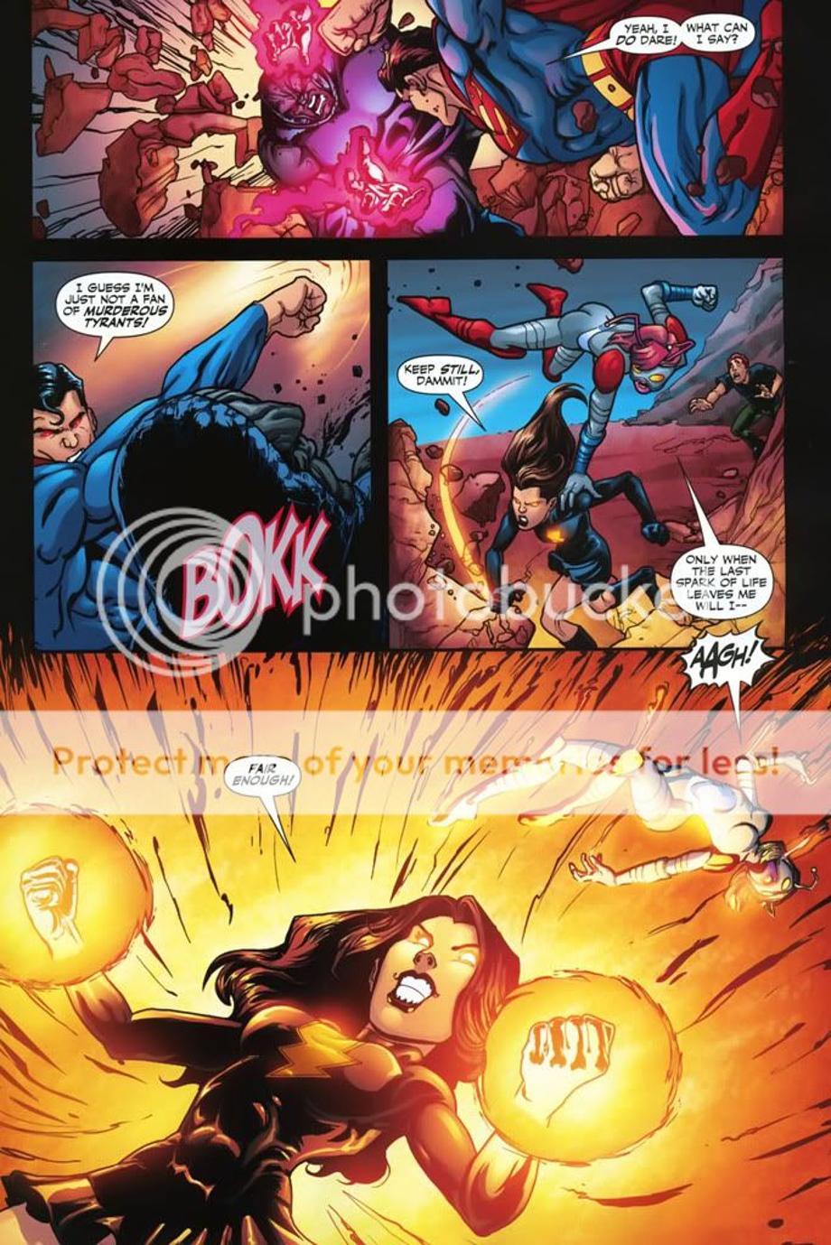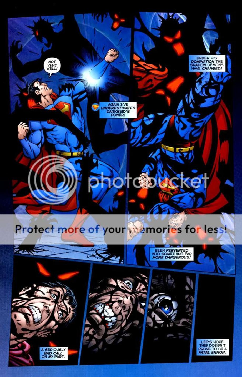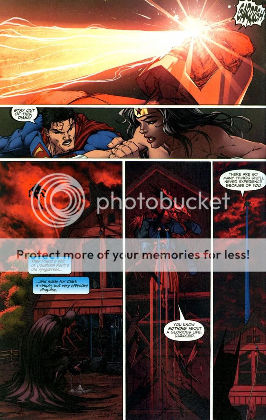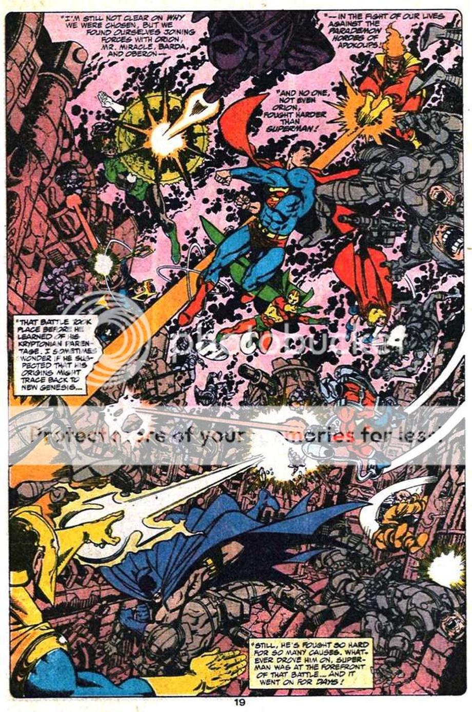 1. An enraged Superman charges at Darkseid, and is easily hit away without much effort.