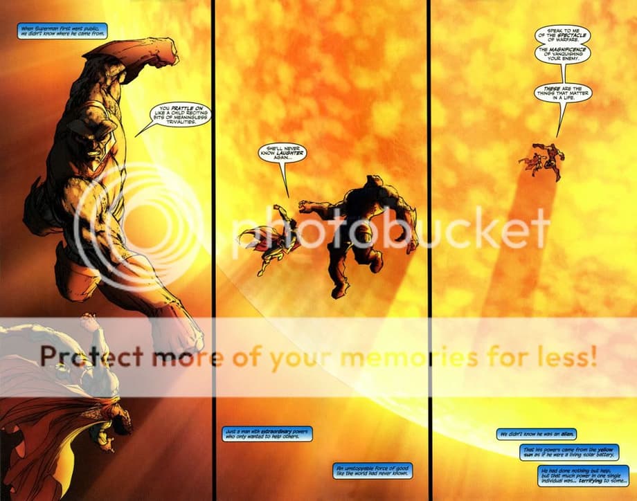 6. It’s a retelling of when Superman and Darkseid first meet, and well the power level is clearly vast as DS backslaps Superman and Clark even admits it would be mad to fight him.