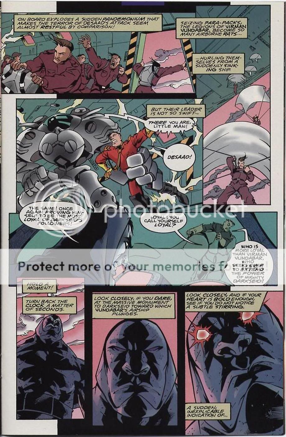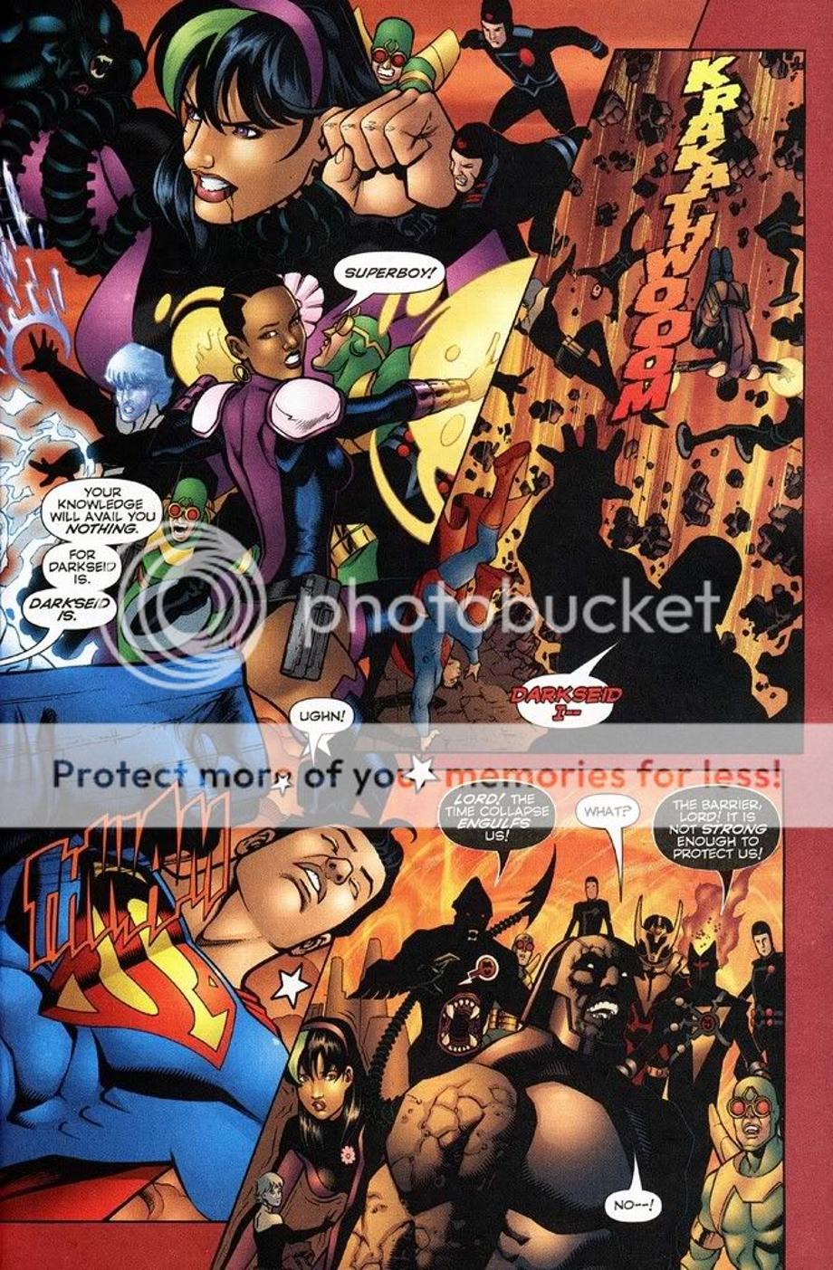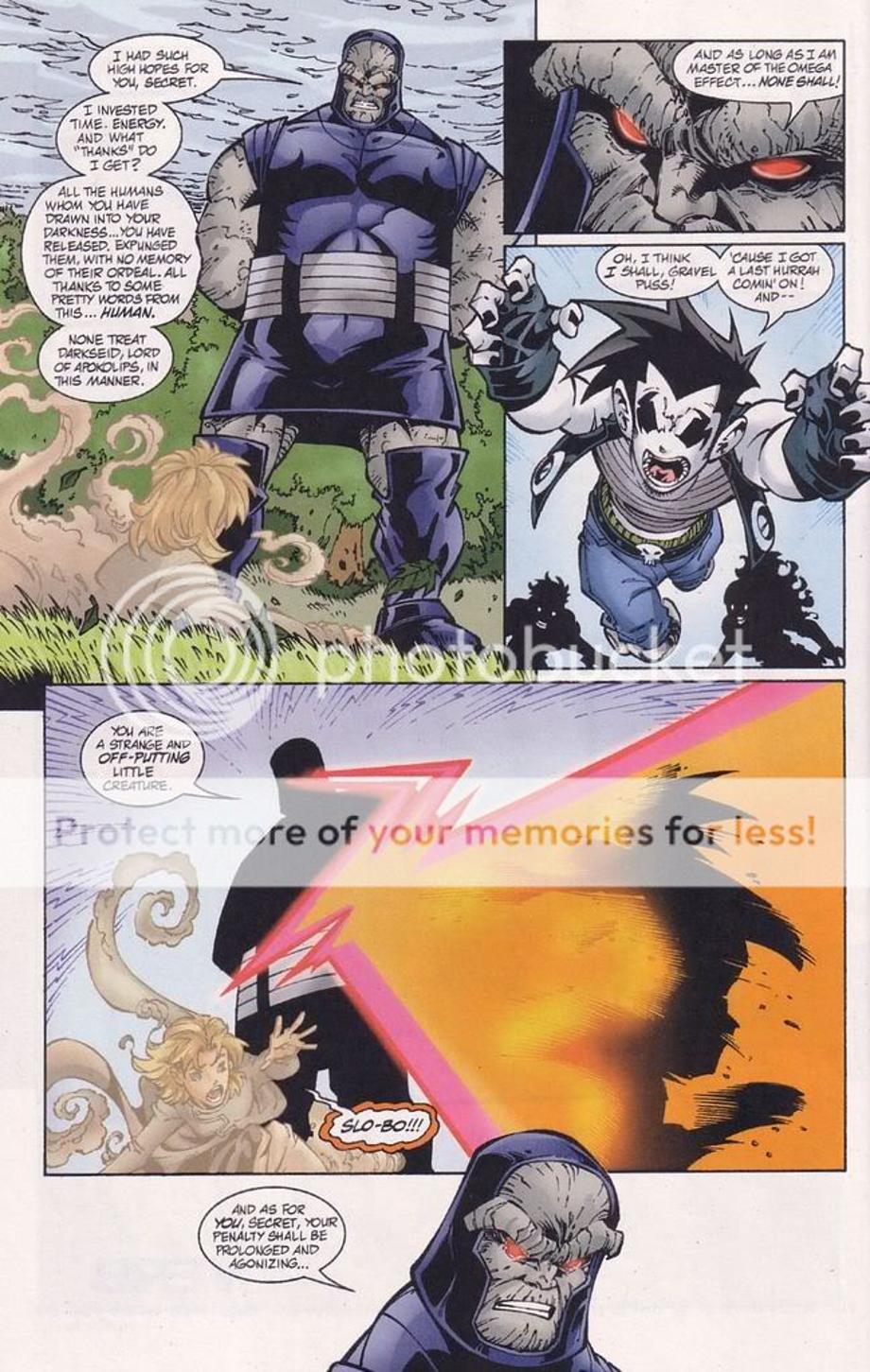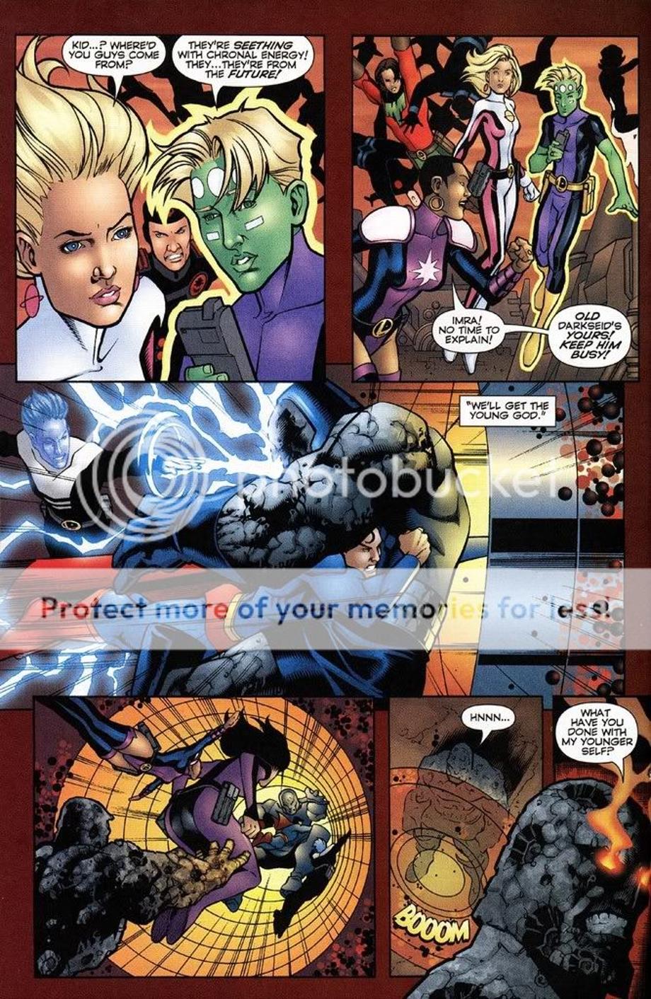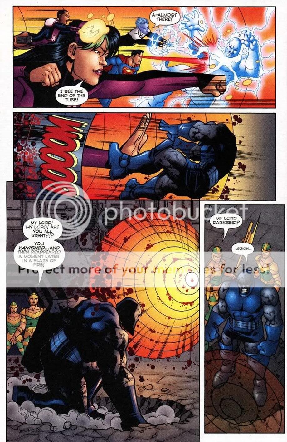 2. Here a newly born Darkseid is brought to the future by his older counterpart, but the Legion time-travel and alter their encounter and work together to send the younger Darkseid back to his timeline. They hit him with their best hits and all it does in the end leaves an unscaved Darkseid, but an annoyed Darkseid.