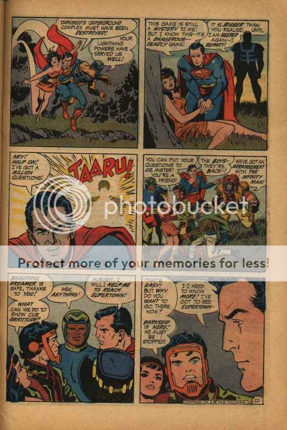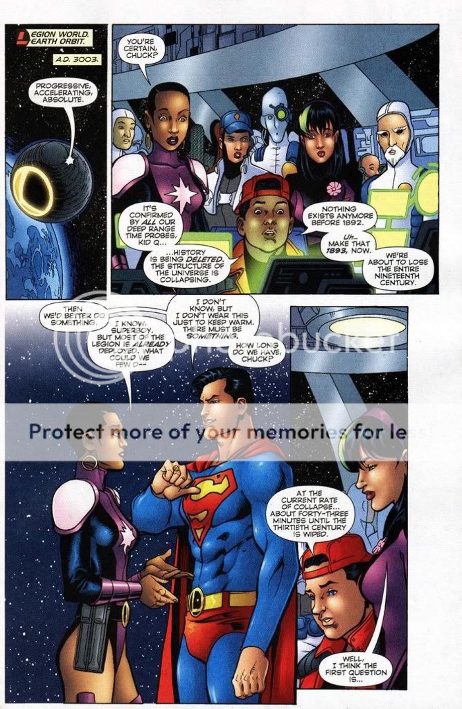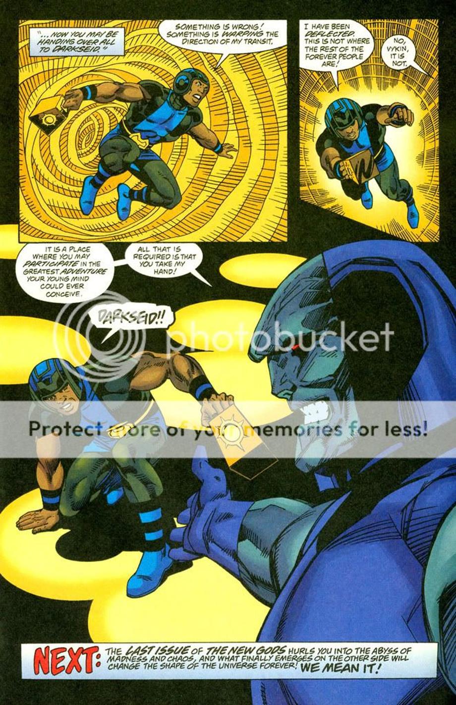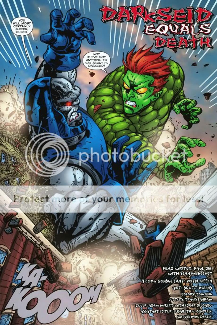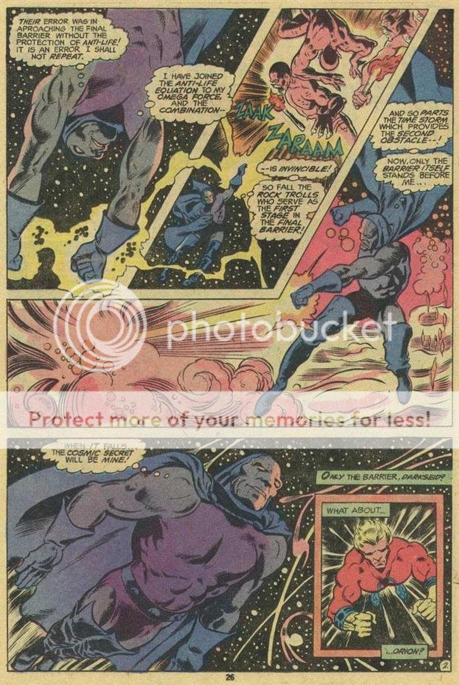 2. Here a newly born Darkseid is brought to the future by his older counterpart, but the Legion time-travel and alter their encounter and work together to send the younger Darkseid back to his timeline. They hit him with their best hits and all it does in the end leaves an unscaved Darkseid, but an annoyed Darkseid.