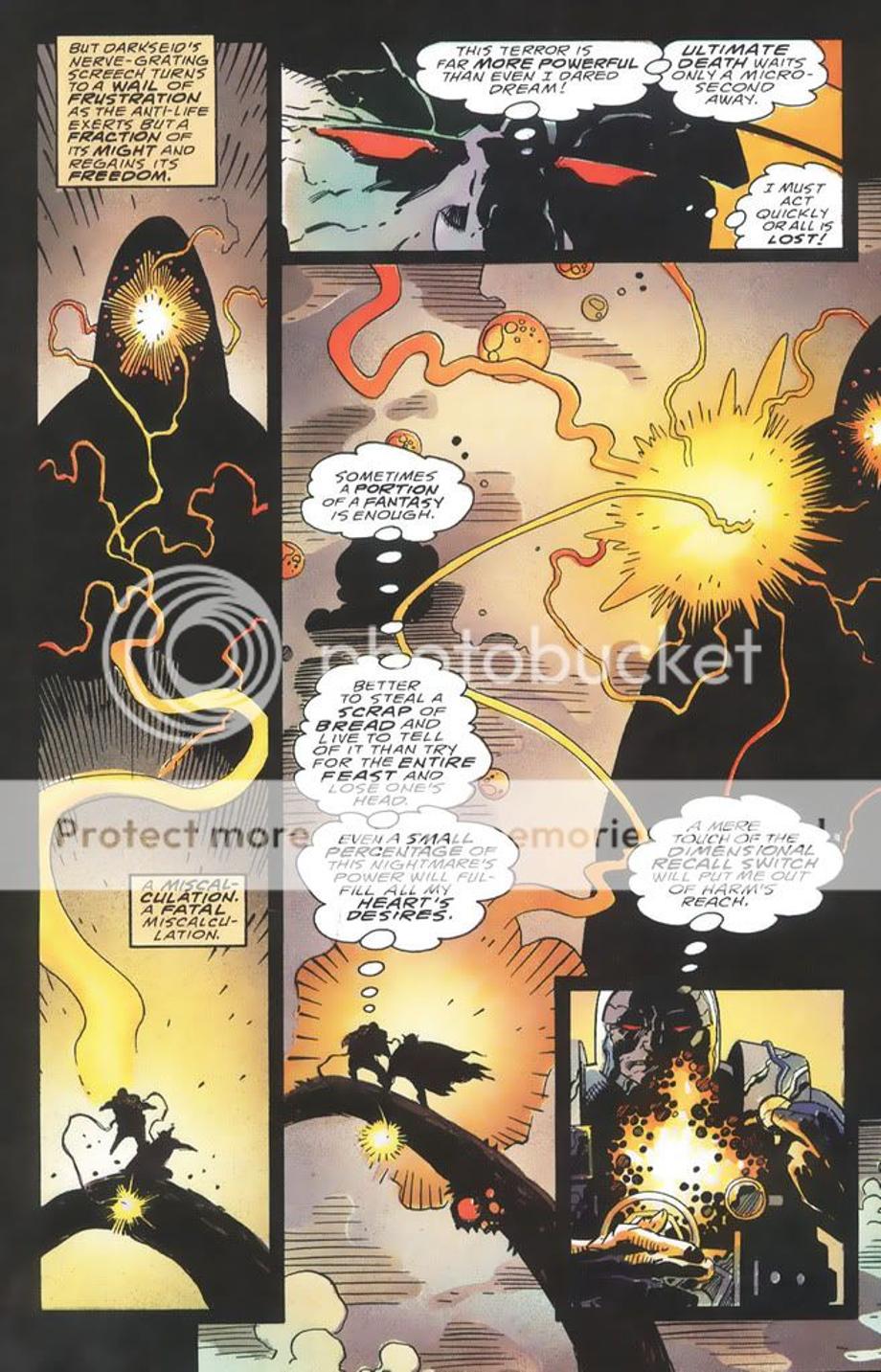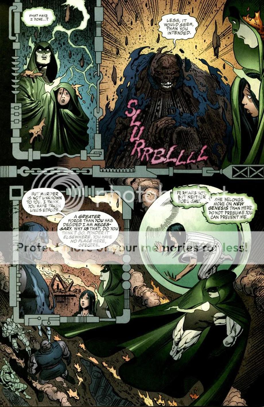 1. Spectre kills Darkseid in combat, but little did Spectre know is DS is protected by the Source and revives him as he is important to the universe being the “negative charge” in it. It’s also revealed if Spectre was successful in killing DS, he in turn would become Darkseid himself.
