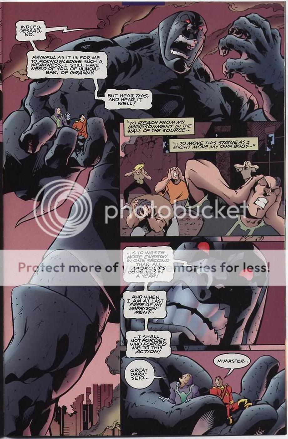 4. Still trapped in the Source Wall, Darkseid shows his great willpower animating a giant statue of him to do his bidding. It takes more energy to move the statue more then all Apokolips does in a year and DS commands the stature for quite awhile.