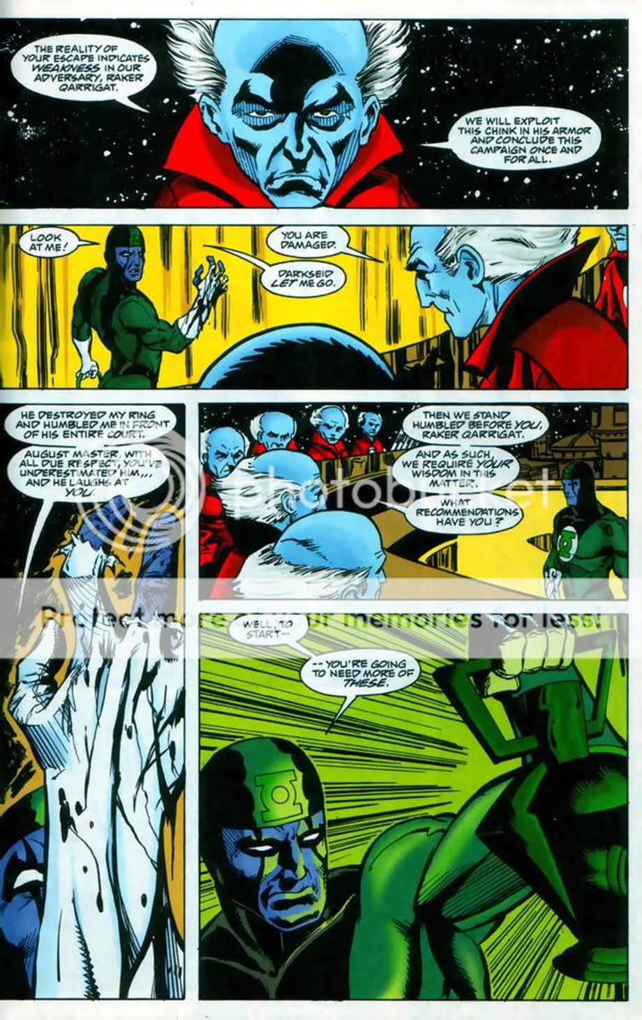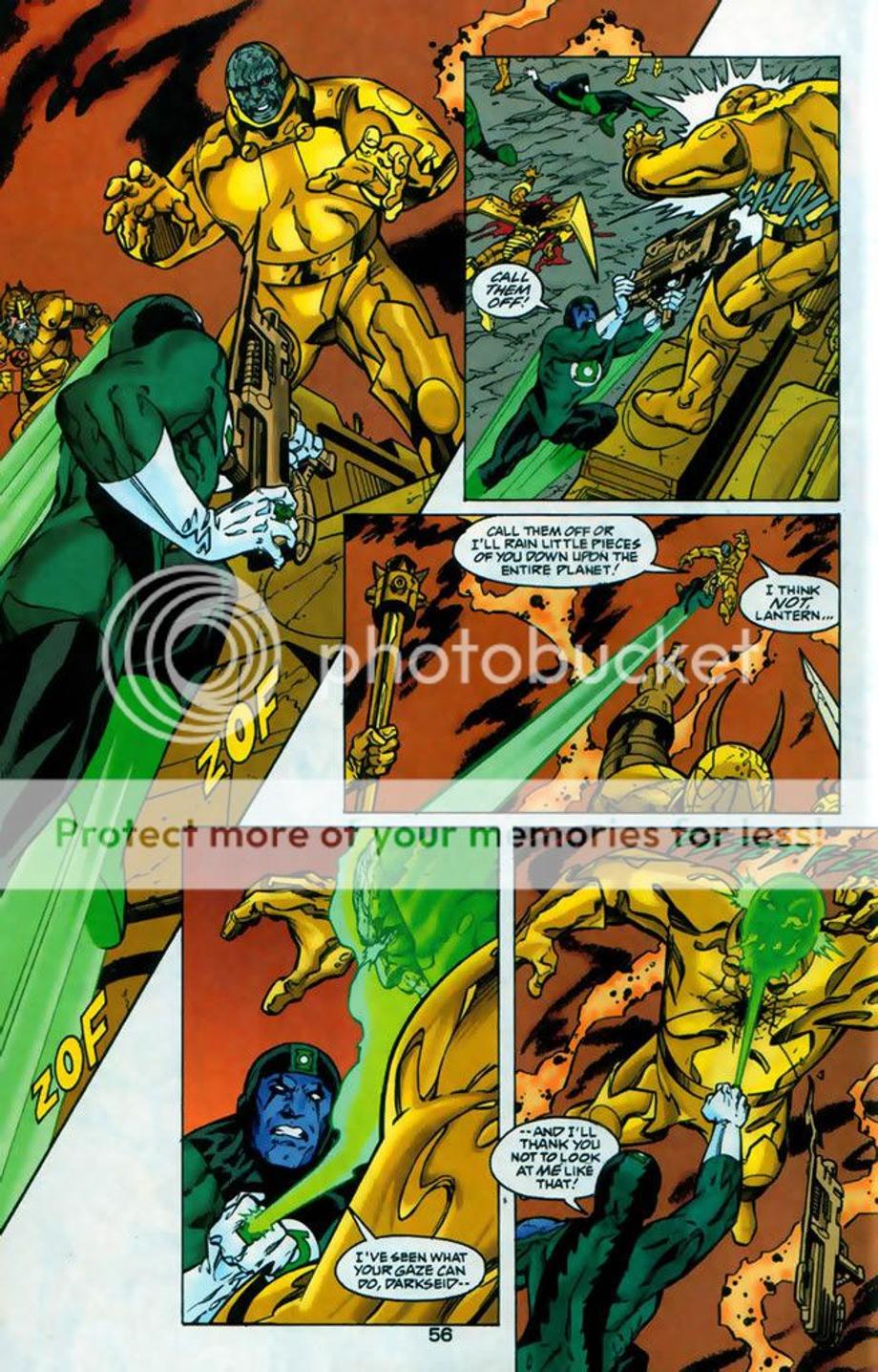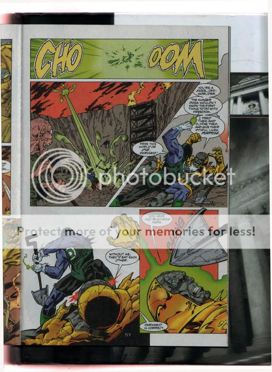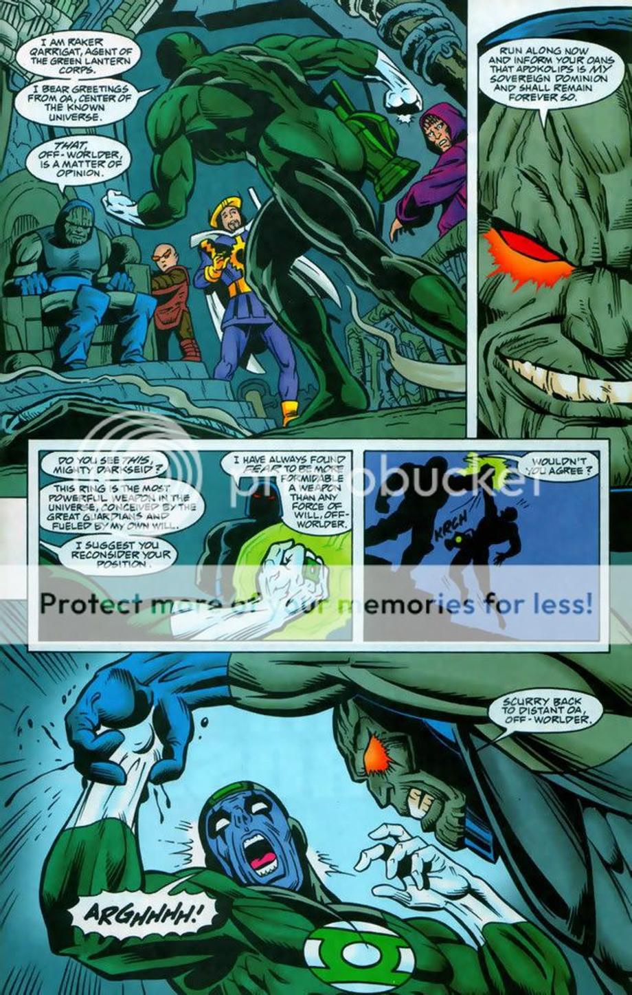 4. 3600 Green Lanterns try to attack Apokolips and dethrone Darkseid from his tyrannical rule. However, DS was prepared for their attack and quickly defeats and kills majority of the corps. Darkseid even snapped the neck of the female Green Lantern Ali, which equally matched Raker in training. It might appear Raker had the advantage at the end, but he really didn’t as the Guardians decided to offer a truce and offer Raker as a trophy for their victory. Later we find out later Raker ends up [not known to him] working for Darkseid.