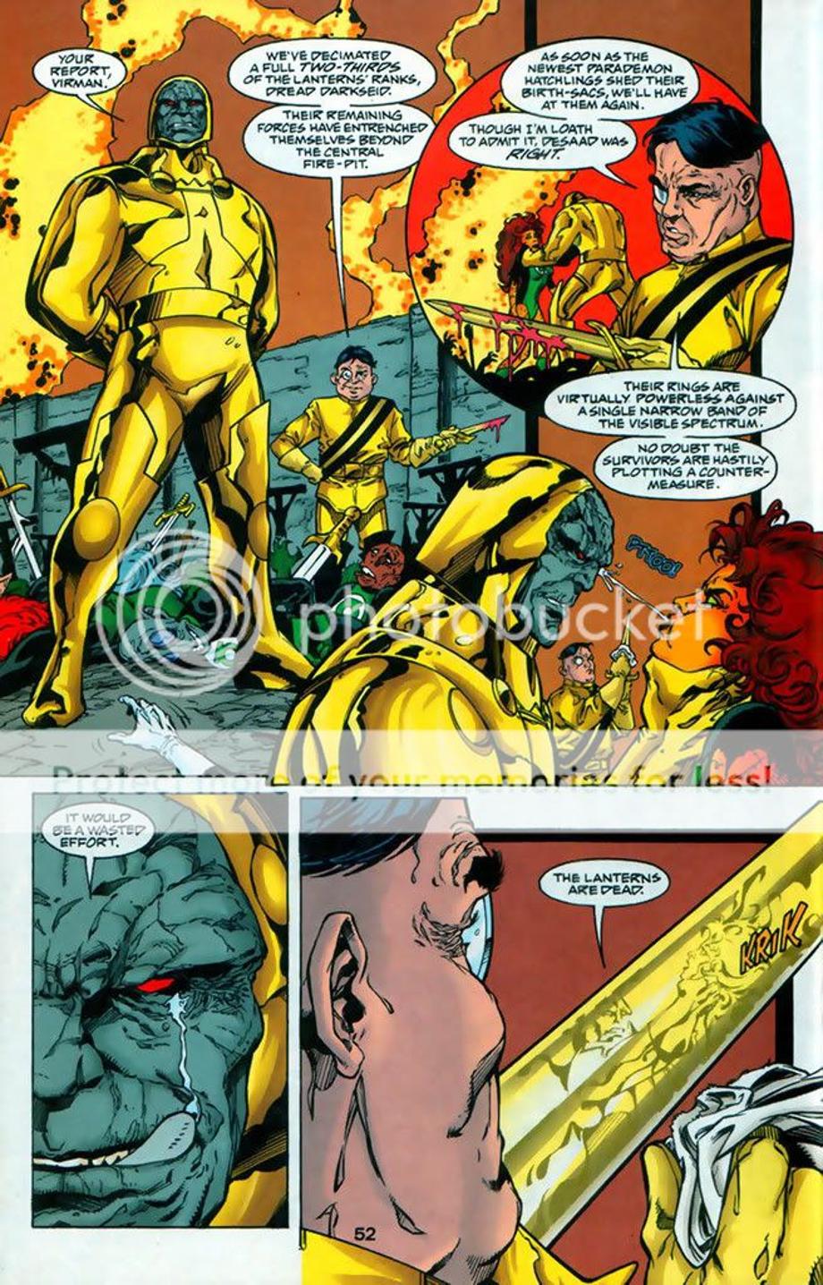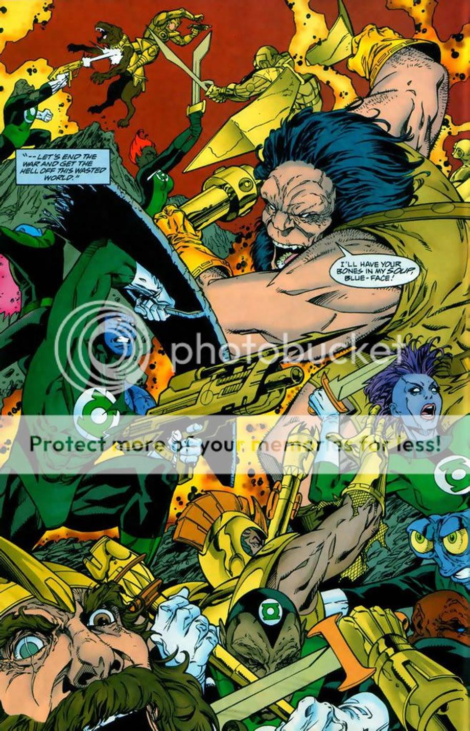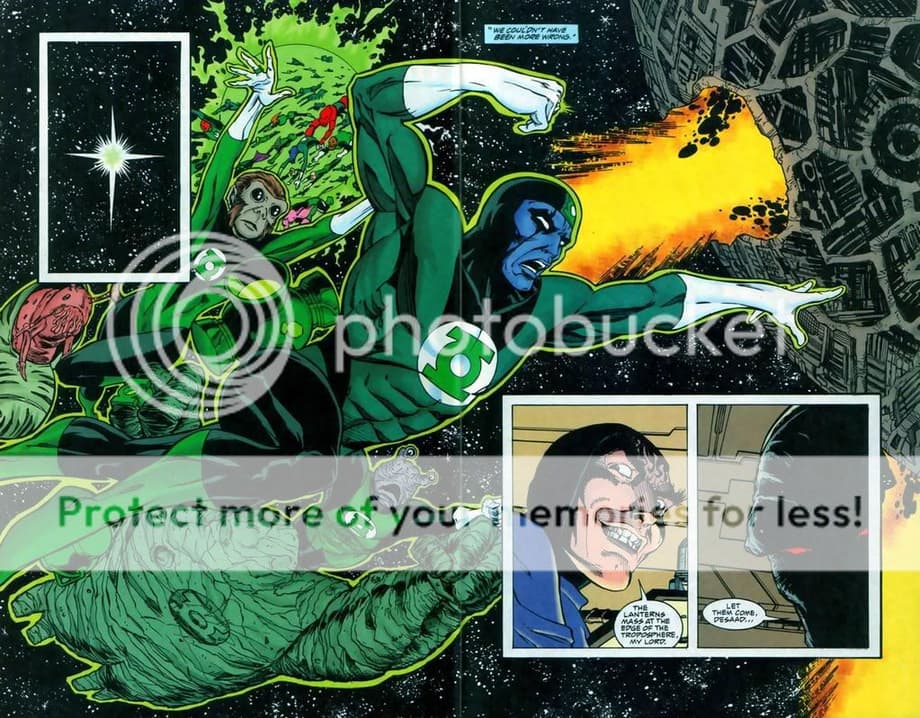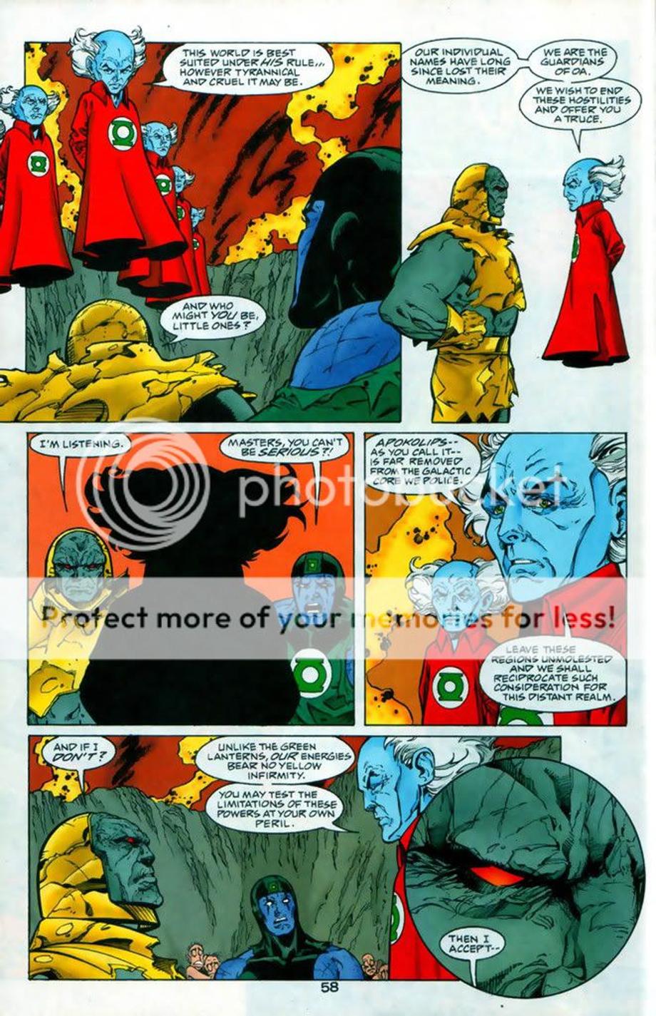 4. 3600 Green Lanterns try to attack Apokolips and dethrone Darkseid from his tyrannical rule. However, DS was prepared for their attack and quickly defeats and kills majority of the corps. Darkseid even snapped the neck of the female Green Lantern Ali, which equally matched Raker in training. It might appear Raker had the advantage at the end, but he really didn’t as the Guardians decided to offer a truce and offer Raker as a trophy for their victory. Later we find out later Raker ends up [not known to him] working for Darkseid.