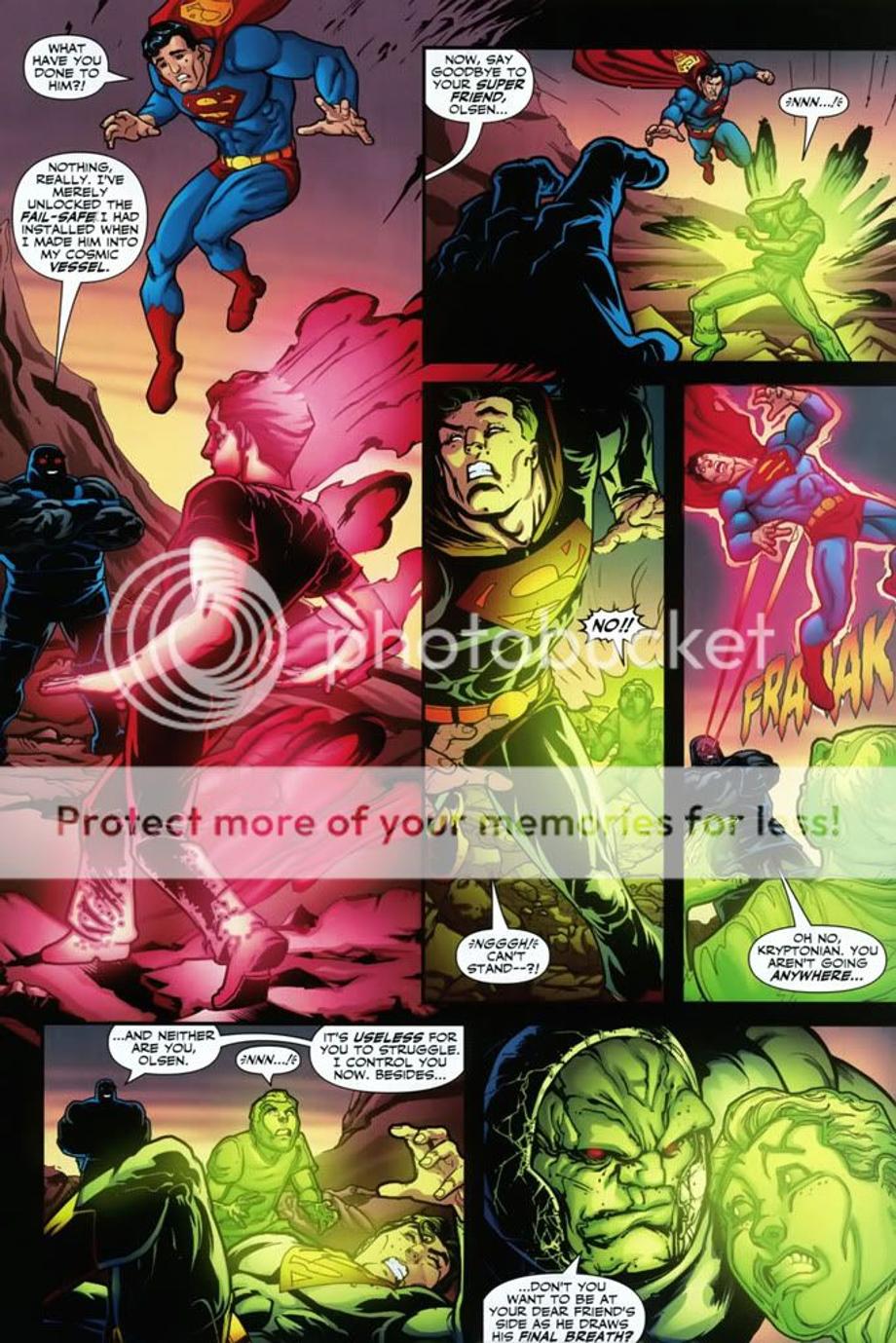6. Darkseid uses a blast and causes Superman to bleed, and then Darkseid activates Jimmy Olsen’s powers and causes him to emit Kryptonite which knocks out Superman.