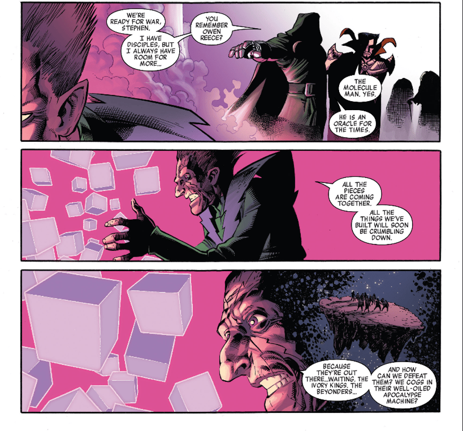 As Rabum Alal Doctor Doom has gathered a number Black Swans who revere Doom as a mythic figure. It was also revealed that Doom has been op[osing the Beyonders with Owen Reece, The Molecule Man, by his side. It is unknown what role, if any, Doom and the Beyonders will play in Marvel's upcoming event Secret Wars, which Hickman's Avengers and New Avengers are currently building up to. However since Doom and the Beyonder played large roles in the original Secret Wars it is speculated that they will have crucial roles in the event this May.