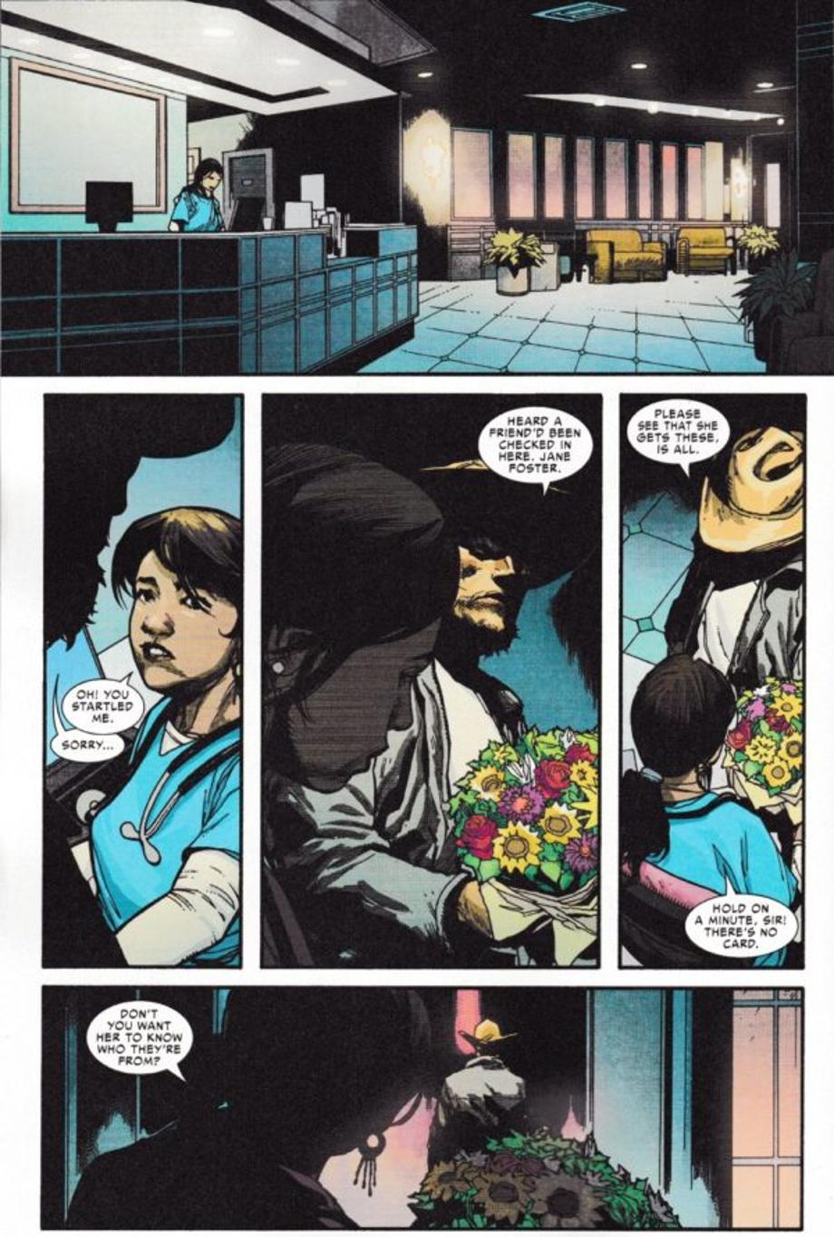 Well, a few months ago, Marvel announced that Logan would show up in a number of different comics due out this month in what they're calling "post-credits scenes." The second of those came in yesterday's issue of Mighty Thor #703 as Wolverine popped into the hospital to leave some flowers - minus a card - for Jane Foster, someone who wasn't even Thor before the mutant ended up dying.
