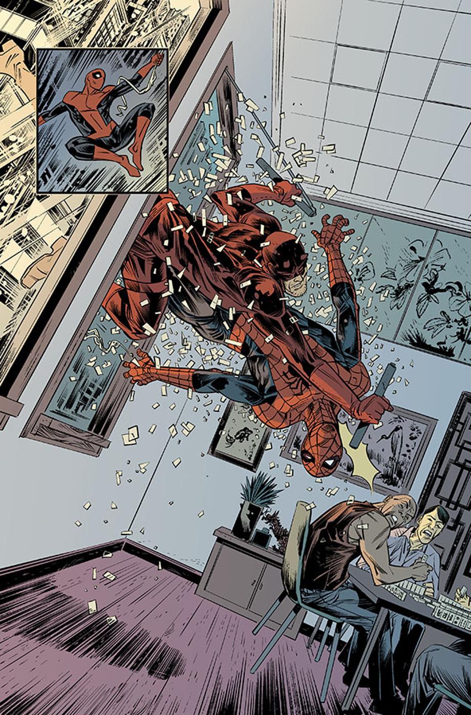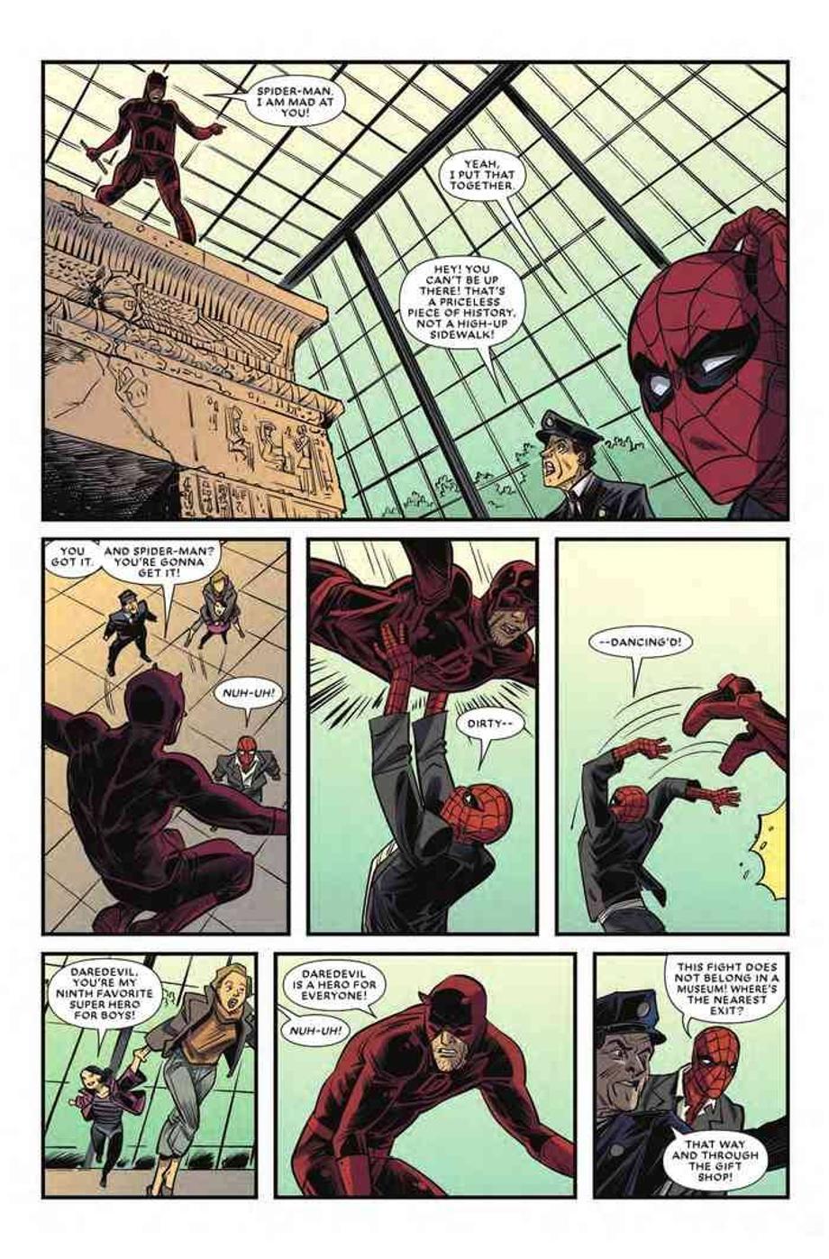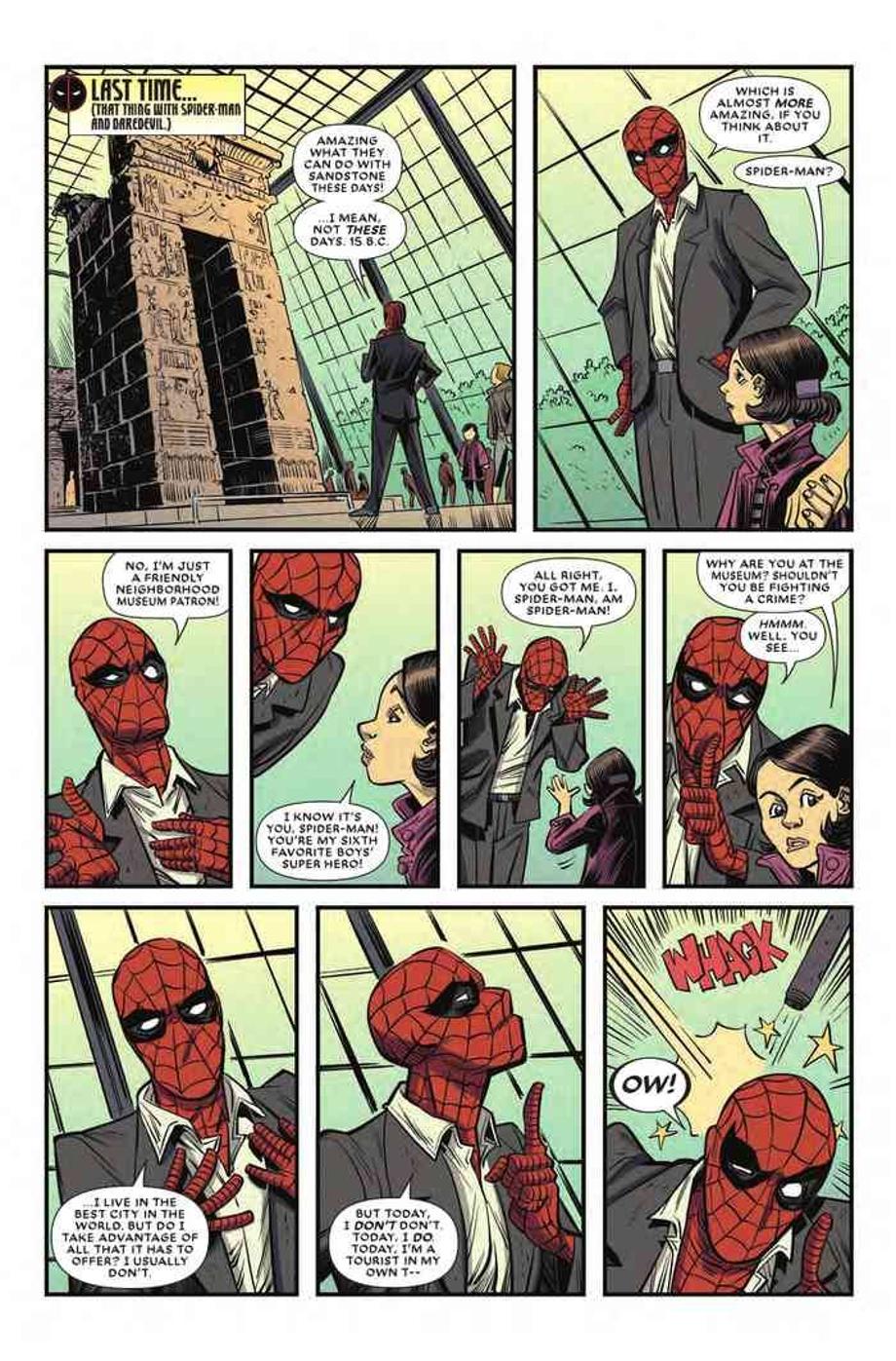 On second look, it actually appears to be Gambit in a Daredevil costume and Deadpool dressed as Spider-Man. Spidey's lack of spider-sense is practically a dead giveaway that's an impostor. Perhaps they both planned to rob the same museum while impersonating a superhero?