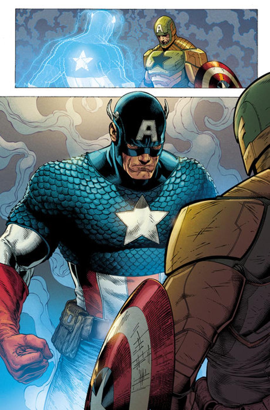 The New York Times has spoiled most of the story as Marvel has chosen to reveal two key panels depicting the return of the heroic Captain America and him using Mjolnir to take down his villainous counterpart. The site also reveals that things wrap up with the heroes standing tall and finally united.