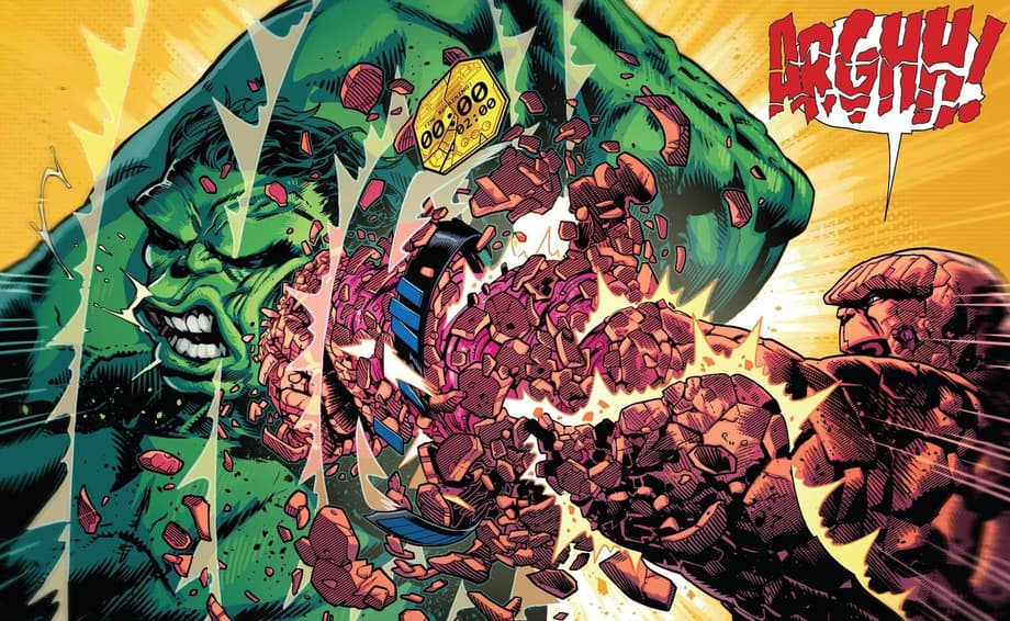 With one powerful punch fuelled by his love for Alicia, Ben hit The Hulk with a blow so hard that it not only knocked out the Jade Giant, but also shattered the rocks that cover his arm. This marks the first time The Thing has defeated The Hulk fair and square, but it does cost him, as the Fantastic Four member wakes up a week later with his arm in a Vibranium cast.
