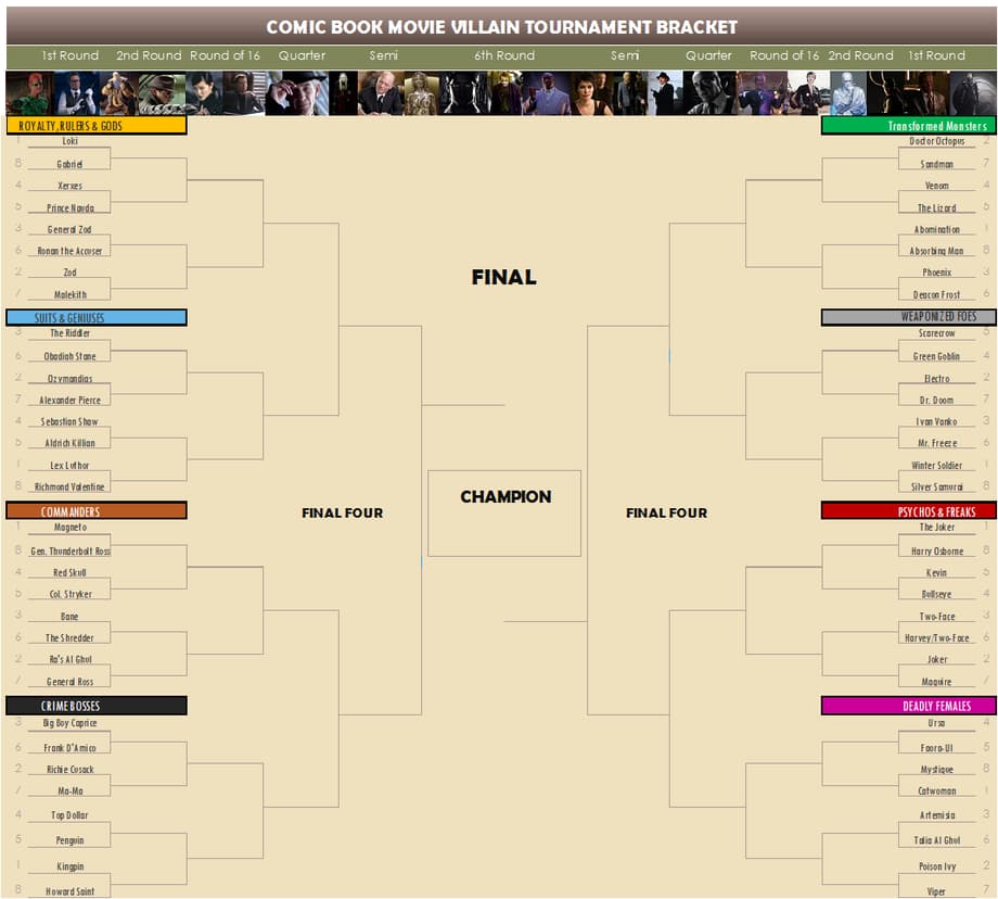 Modeled after NCAA's Basketball tournament, this bracket is divided into 4 divisions. Within those four are 8 categories, ranging from Beasts to Mobsters. All villains picked are seeded 1-8, and there are some duplicate characters like