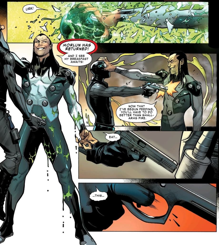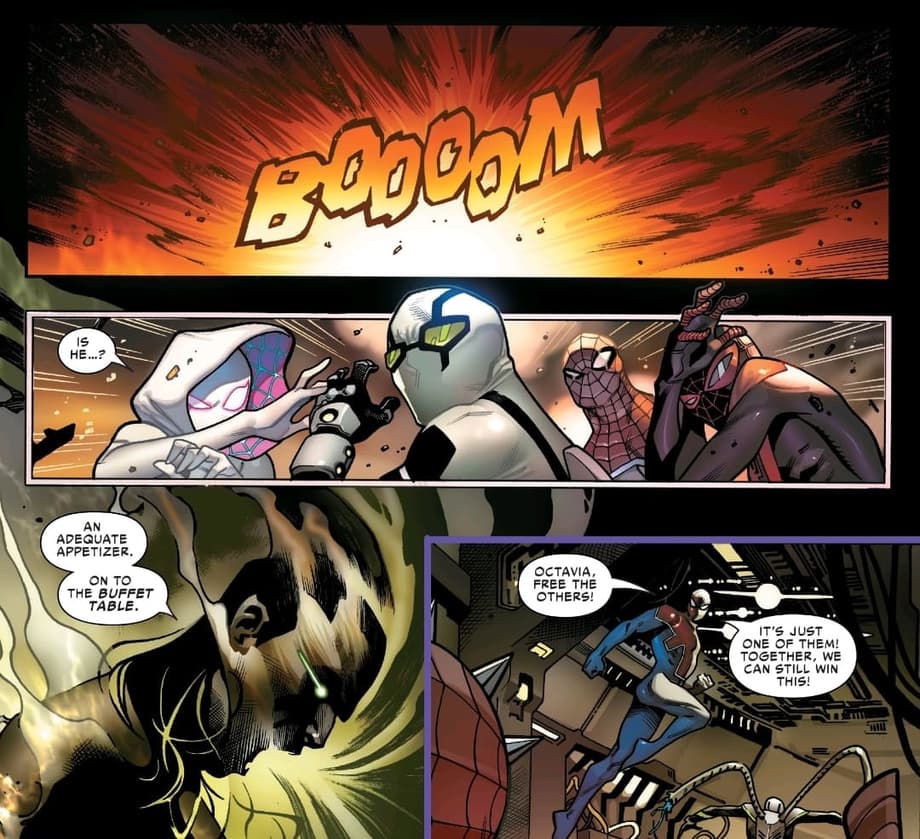 As you can see, the first victim is Spider-Man Noir when he attempts to blow Morlun up only to get devoured in the process. Second is the popular Captain Britain/Spider-Man hybrid who has his neck broken despite being one of the most powerful alternate universe Spider-Men. The 616 version of Peter Parker isn't expected to factor into the event beyond tie-in issues, so at least we know he's safe.