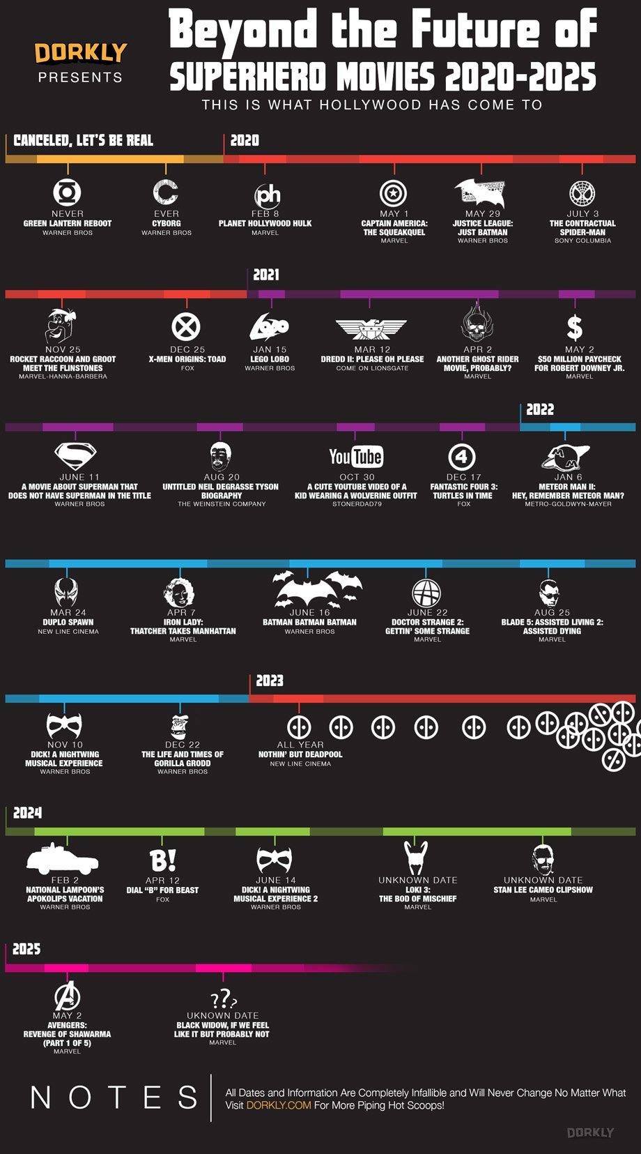 Justice League: Just Batman? The Contractual Spider-Man? Stan Lee Cameo Clipshow? These are just a handful of the movies which are NOT on the way between 2020 and 2025 in this fun new infograph poking fun at the dominance of superhero movies. Check it out!