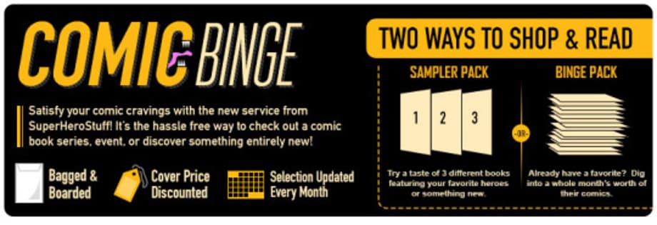 Great for both hardcore fans and newbies looking to get into comic book collecting, the Comic Book Binges are special non-subscription preorders that ship out every month (once the selected comics come into production). You simply place your order and in a couple of weeks...BAM! You will have a box shipped to your location with the very cutting edge of brand spanking new comics. This is a unique and easy way to stay up to date with some of your favorite characters.