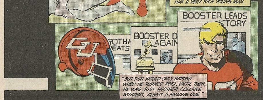 Born in the year 2442, Michael Jon Carter was a star quarterback at Gotham University on full scholarship. When his gambling-addict father re-enters his life after years of neglect, he convinces Michael to shave points and deliberately throw games. When this illegal activity is discovered, Michael is thrown off the team and kicked out of the University. Later in life, Carter is able to land a job as a security guard at Metropolis Space Museum, which contains paraphernalia from the Legion of Superheroes (force-field belt and flight ring) and Rip Hunter's time machine. Together with the museum's security robot, Skeets, Carter travels back in time to the 20th Century to become a superhero and start a corporation to become rich life Bruce Wayne. Nicknamed Booster on his football team and attempting to go by Goldstar in his debut as a superhero in the 20th Century, a mix up results in the two nicknames being combined and Carter is forever known as Booster Gold.