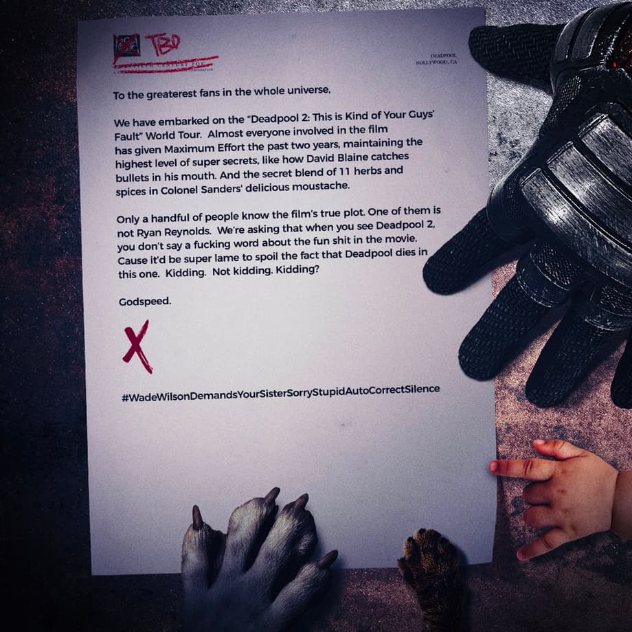 This was probably inevitable, but like Thanos, Wade Wilson (via Ryan Reynolds' Twitter account) is now also "demanding your silence" and asking fans "not to say a [frick]ing Word about the fun shit" in Deadpool 2.