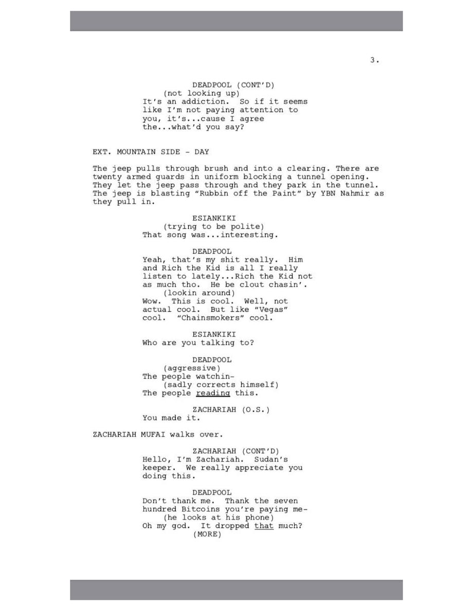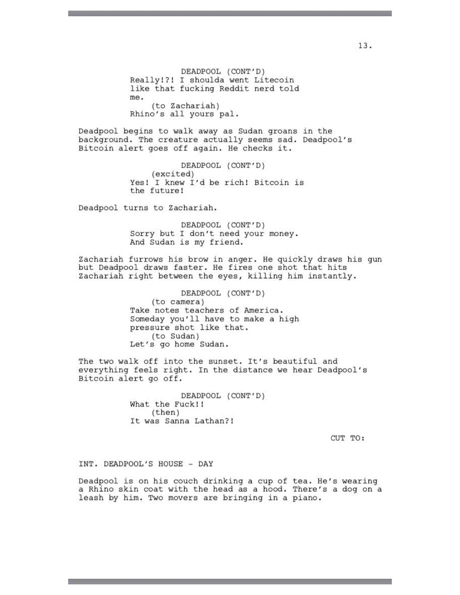 Deadpool bails on Sudan when Bitcoin drops, but then, has a change of heart when the prices soar yet again. He makes another reference to recent events and walks off into the sunset with his new rhino friend.