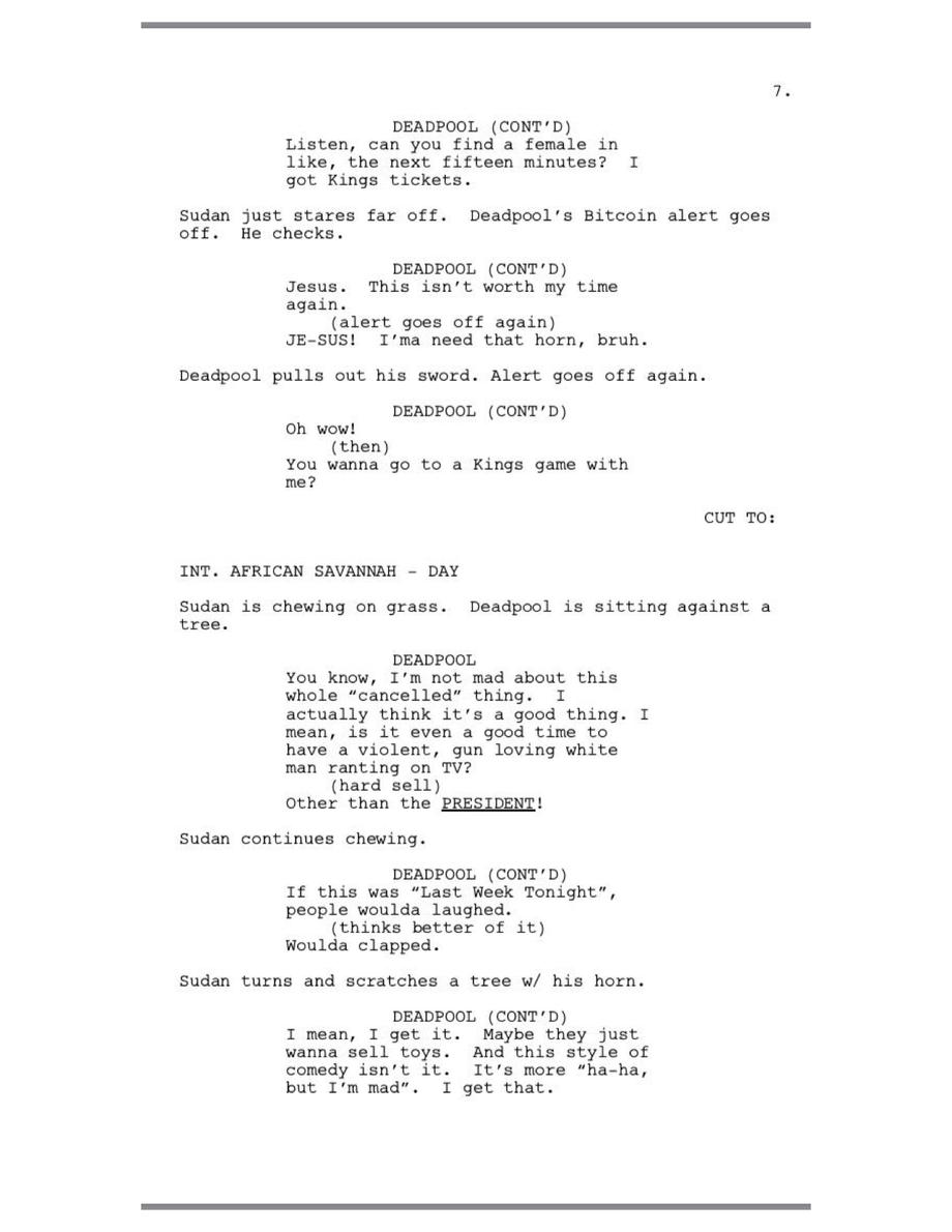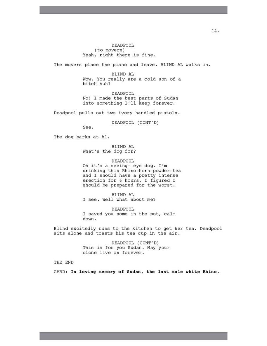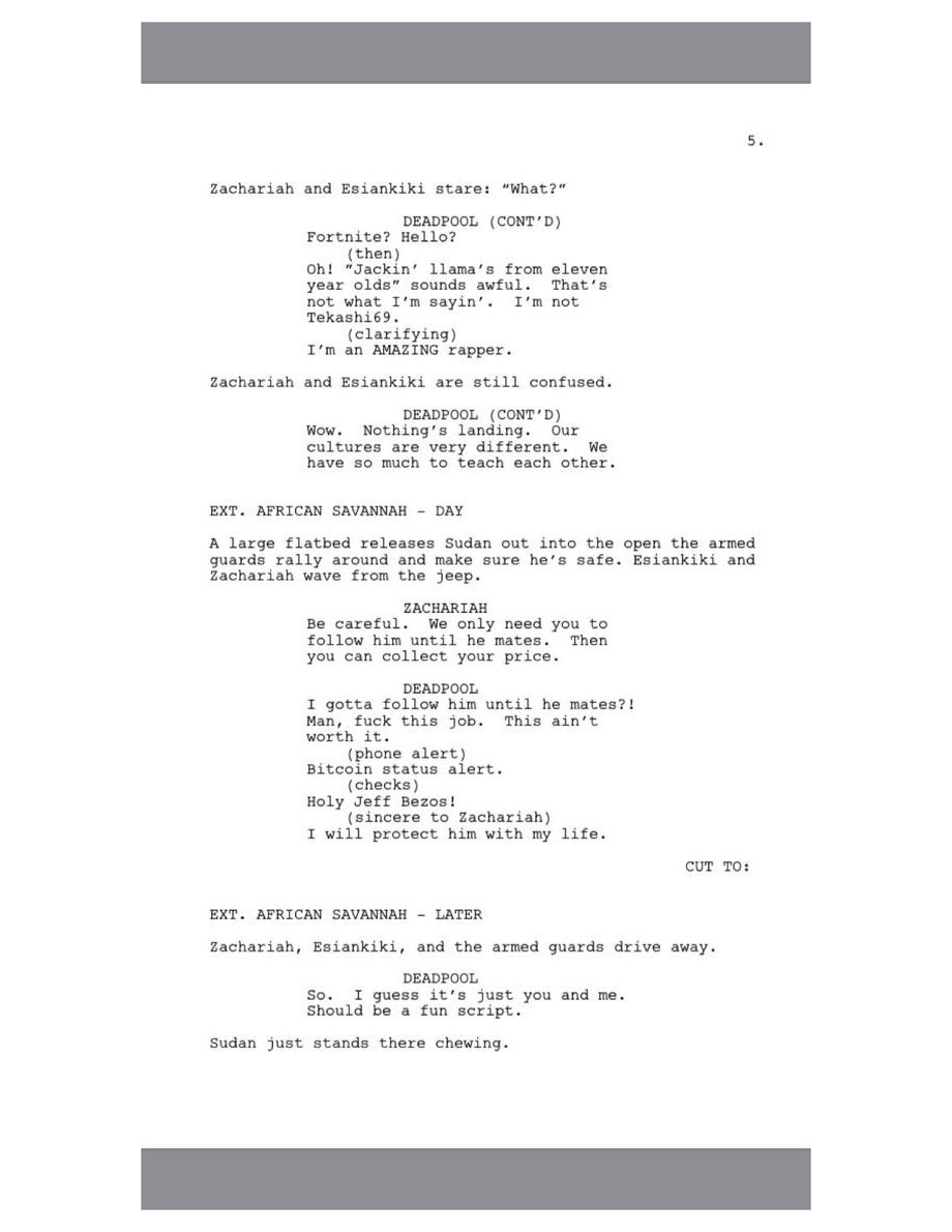 Deadpool laments over the dropping Bitcoin prices and makes a funny dig at Johnny Depp before meeting Sudan, the last male northern white rhino on Earth. A couple semen jokes later and we find out Deadpool's plays Fortnite.