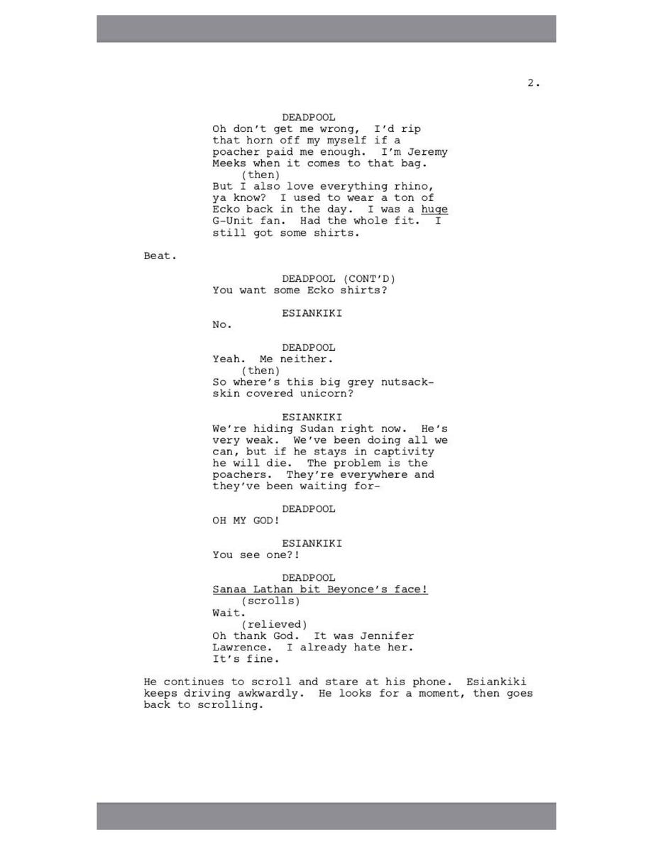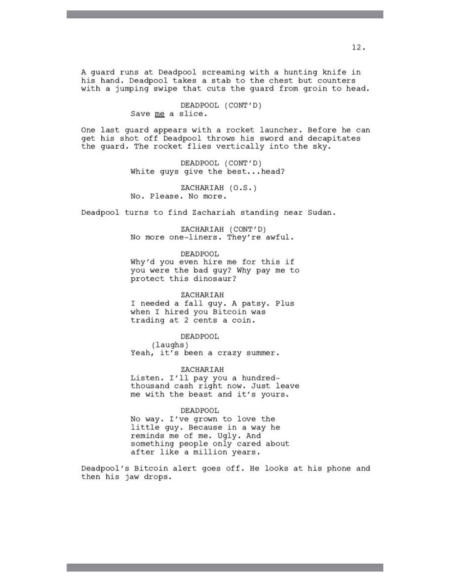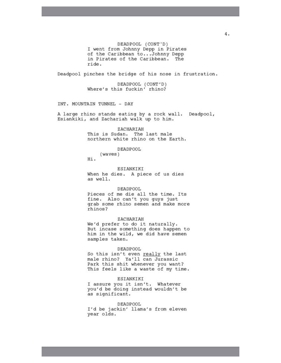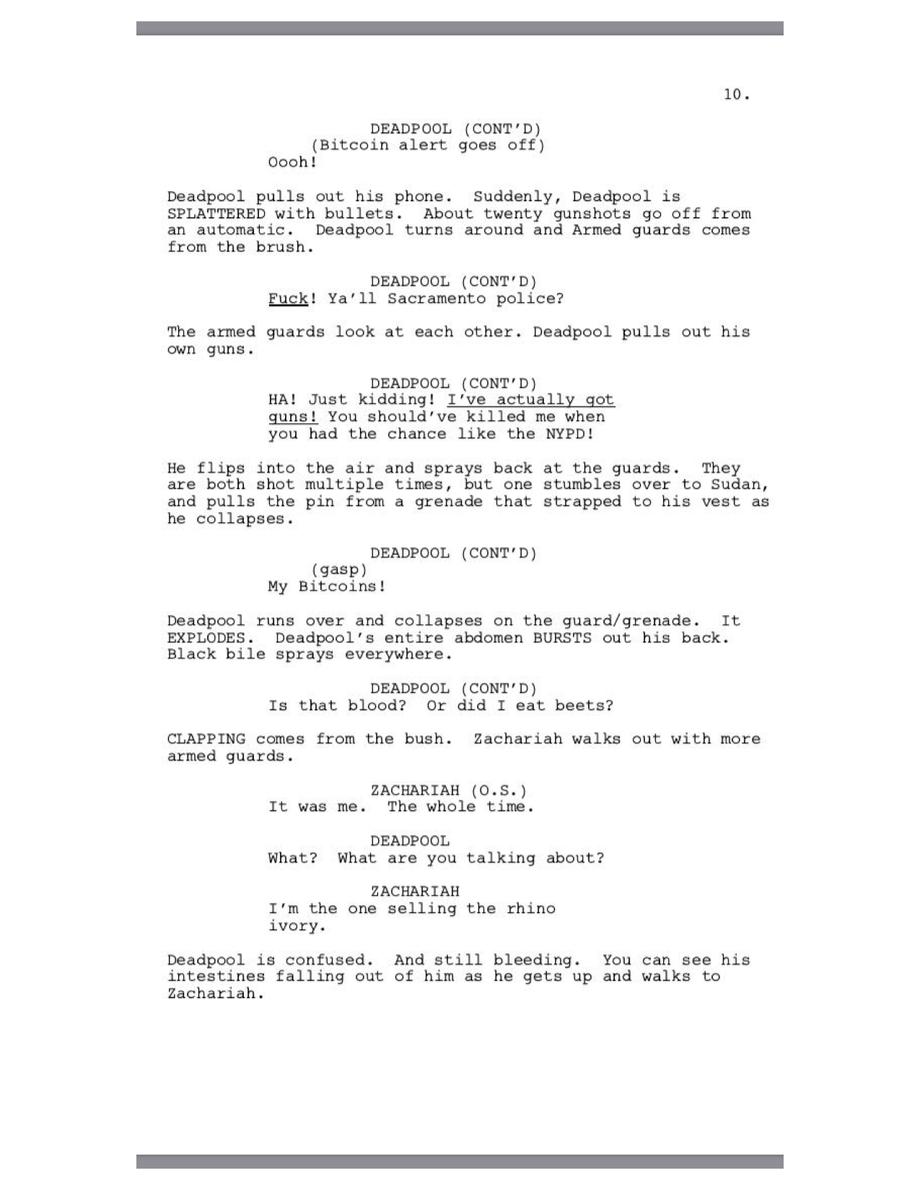Deadpool laments over the dropping Bitcoin prices and makes a funny dig at Johnny Depp before meeting Sudan, the last male northern white rhino on Earth. A couple semen jokes later and we find out Deadpool's plays Fortnite.