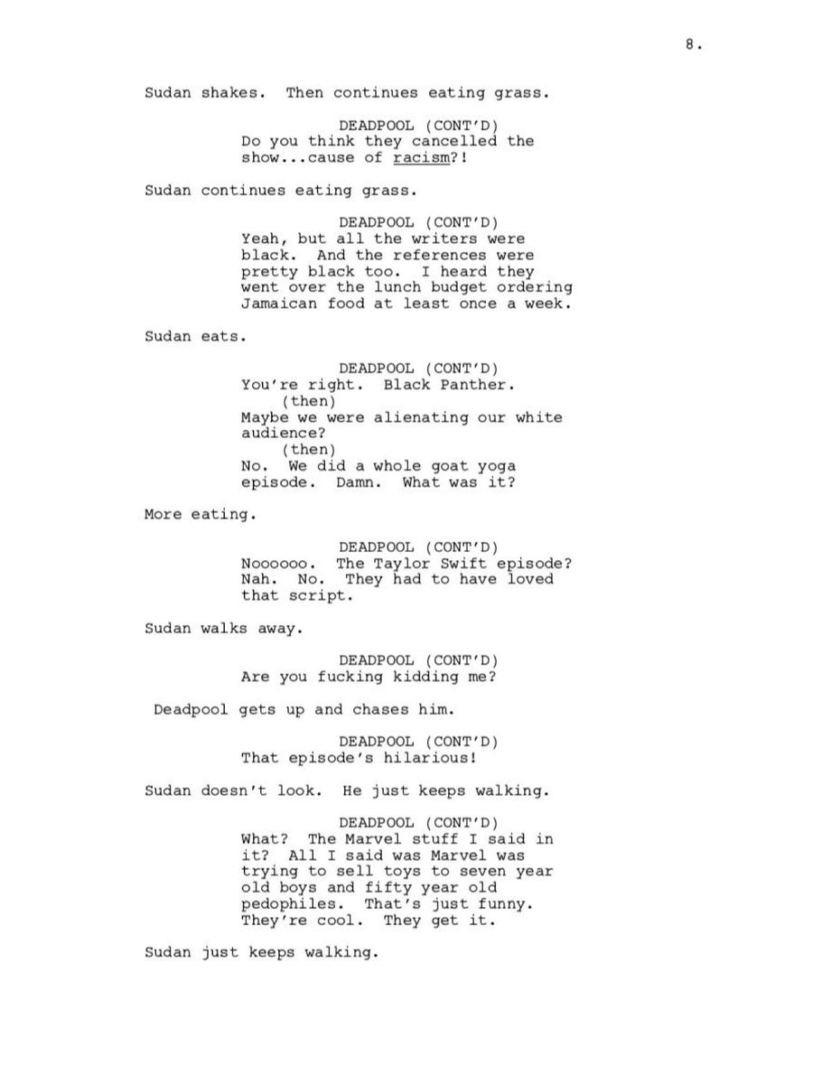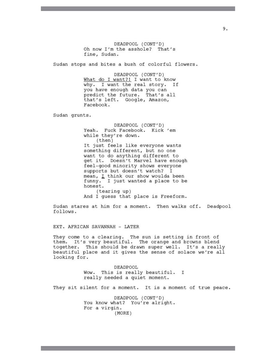 Deadpool gets extra meta when he breaks the fourth wall to communicate to the audience, and Glover seemingly expresses his sadness that his audience will only get to read this script online and not actually get to watch the series.
