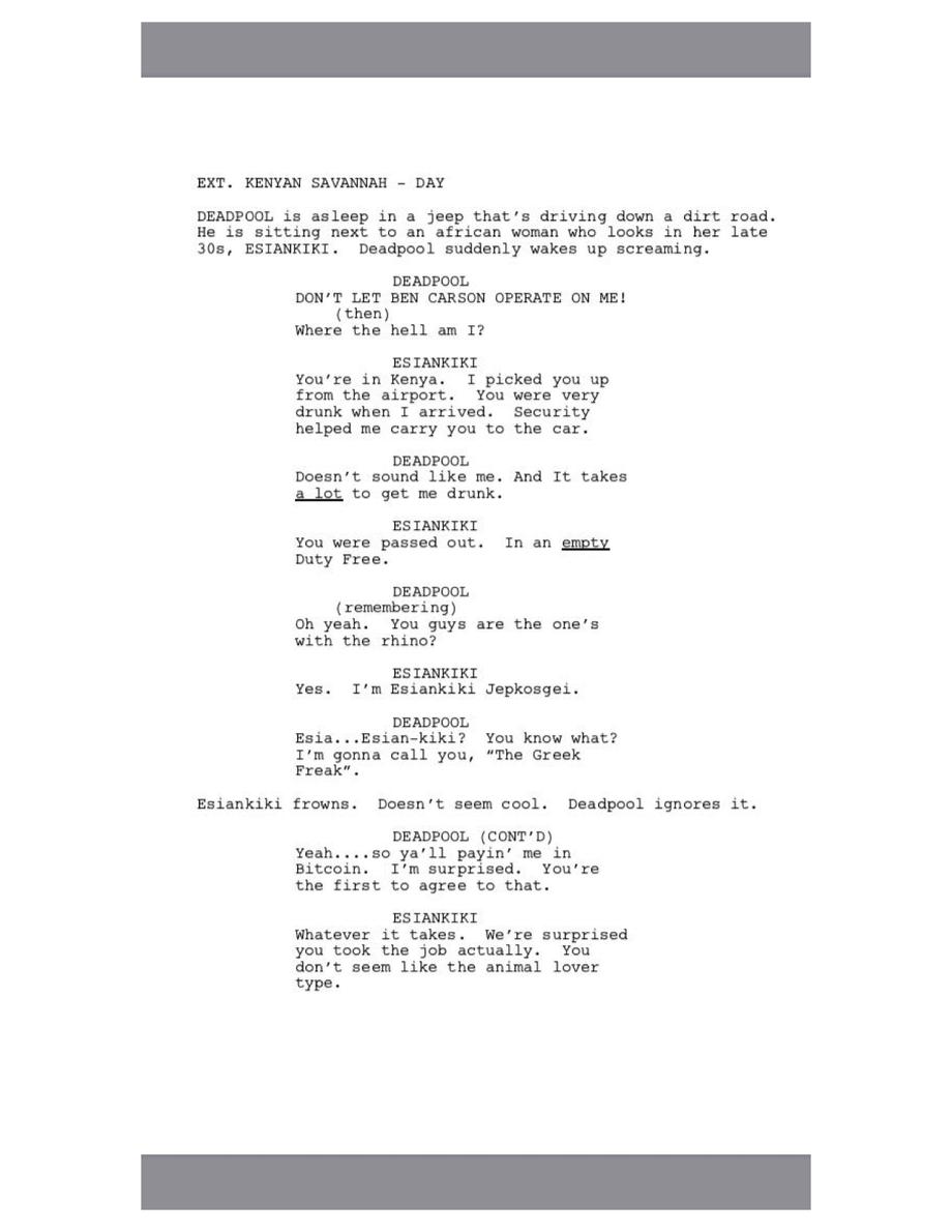 The Merc with a Mouth abruptly awakens in Africa for his latest mission and meets a woman named Esiankiki, who chats with him about a rhino before Deadpool makes the situation worse by making a racist Giannis Antetokounmpo joke.