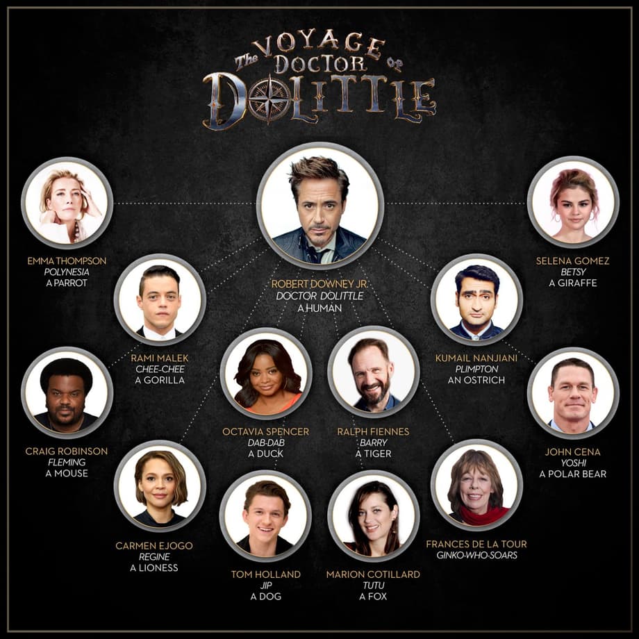 Avengers: Infinity War star Robert Downey Jr. has unveiled the full cast that'll be joining him in the upcoming Voyage of Doctor Doolittle film over Twitter, and director Stephen Gaghan has acquired some big names to provide the voices of the various animal characters.